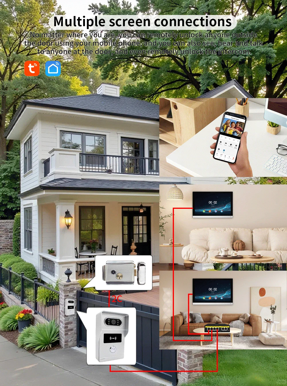 Connect up to 4 outdoor doorbells and 6 indoor monitors,