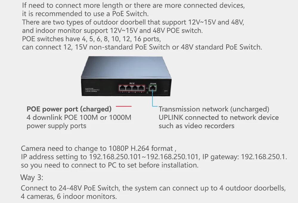 For more than 2 devices, please use a standard protocol POE switch. Please purchase and use the POE switch we provide, otherwise there is a risk of burnout.How to connect TUYA APP tutorial video