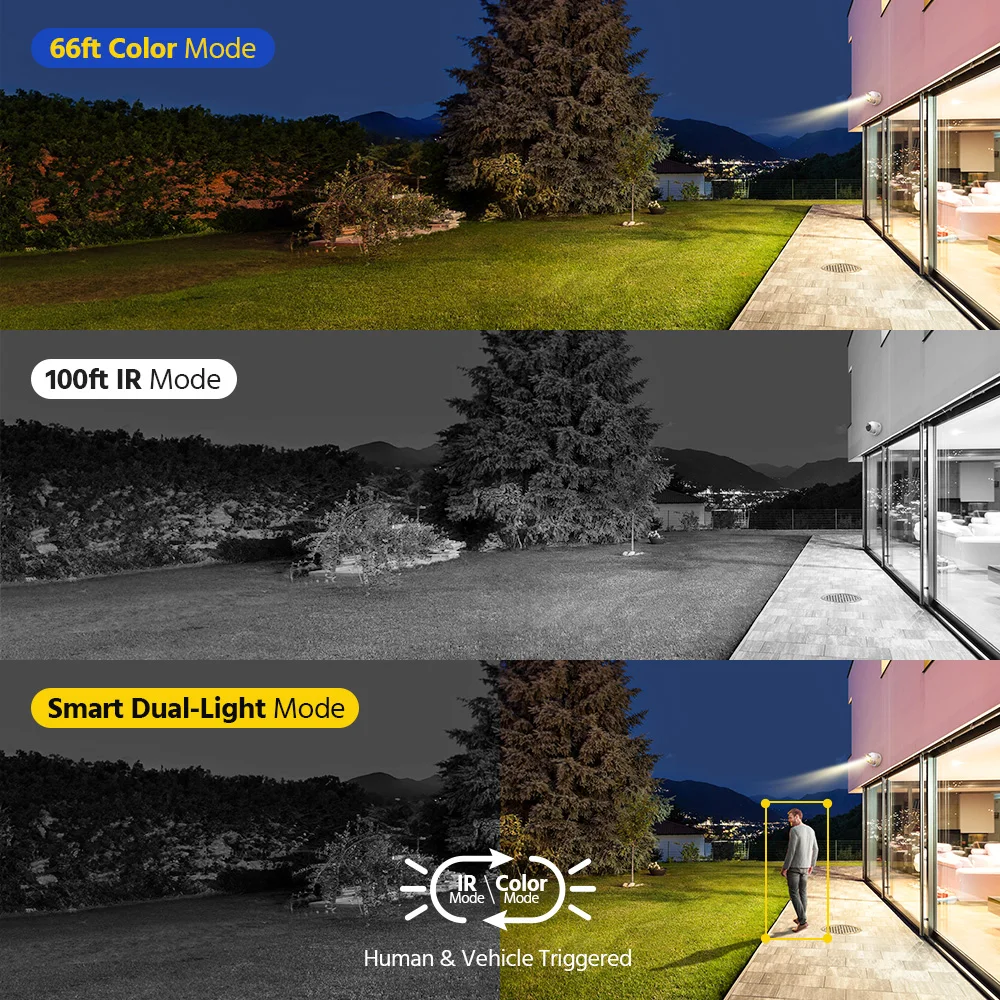 IR light works normally, and it switches to white light when human or vehicle are detected at night. |