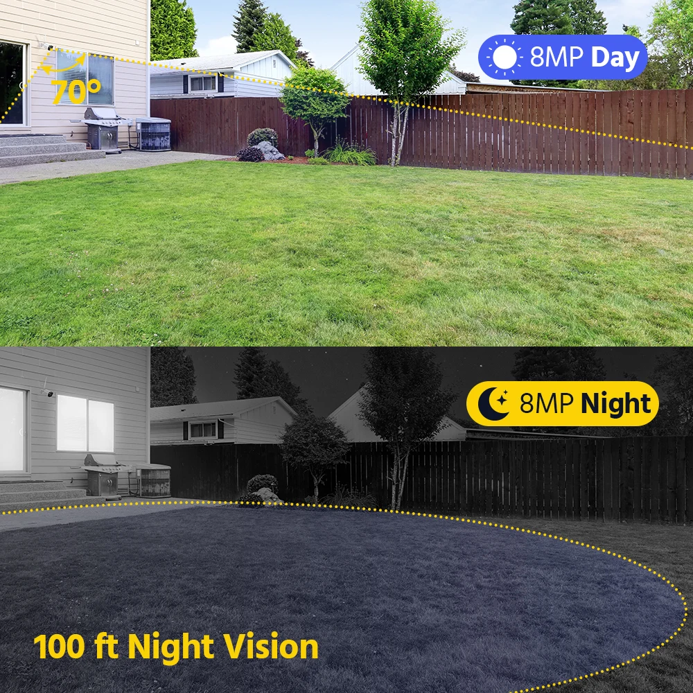 Get crystal-clear 8MP resolution for real-time monitoring, recording, and playback. With enhanced 30m infrared night vision, this camera guarantees high-quality surveillance, even in complete darkness.