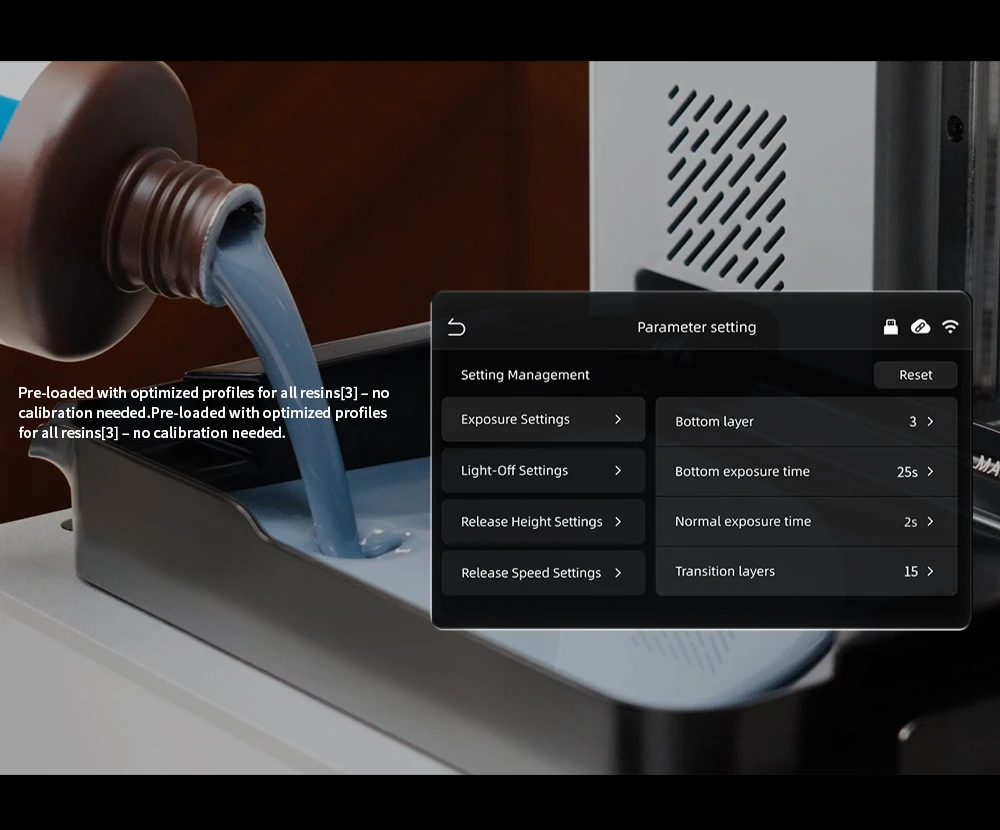 Pre-loaded with optimized profiles for all resins – no calibration needed.