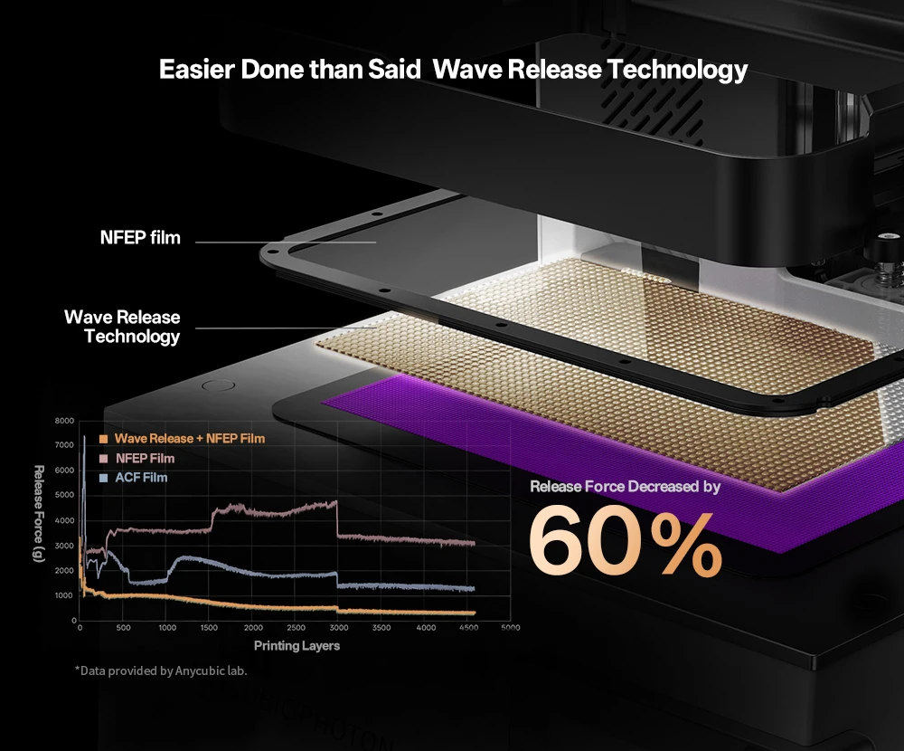 The Wave Release Technology reduces release force by a massive 60% compared to traditional smooth-surface NFEP film, ensuring superior print quality and consistency.