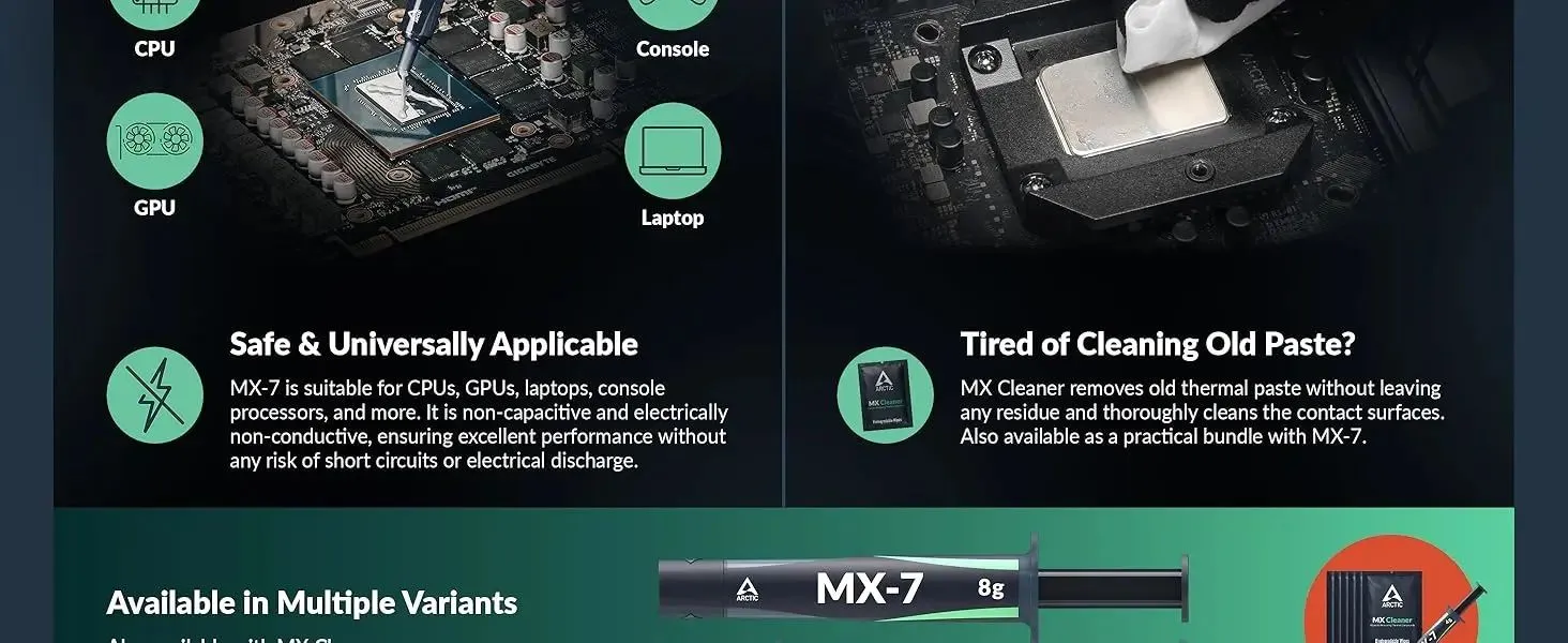 In contrast to pastes based on metal oxides or liquid metal, ARCTIC’s MX-4 is metal-free and not electrically conductive.