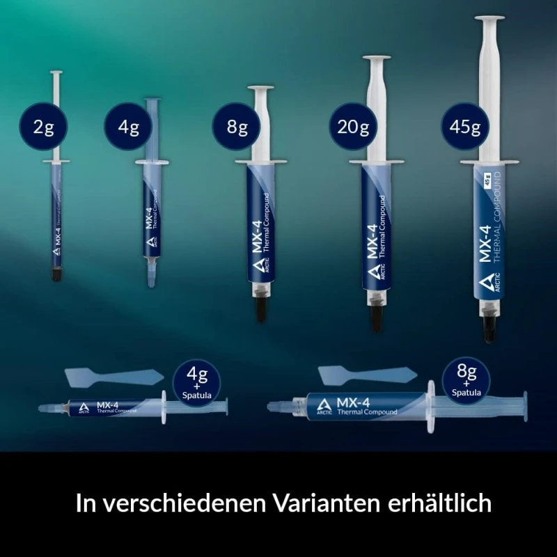 ARCTIC MX-4 is available in sizes ranging from 2 to 45 grams. Resealable packaging prevents the paste from drying out.