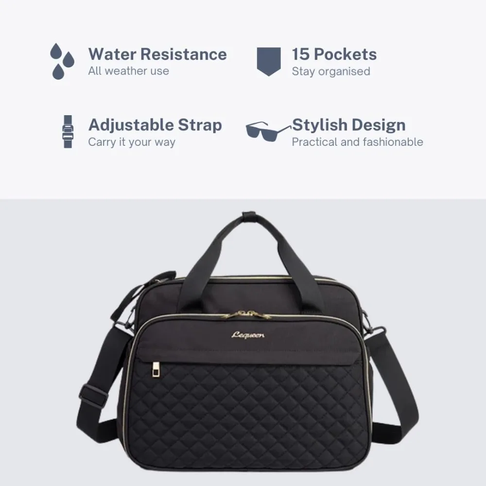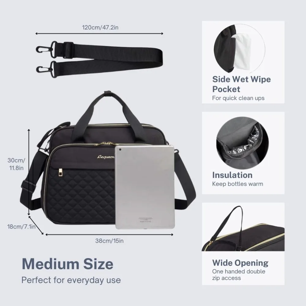 SUPERIOR STORAGE CAPACITY. 18 pockets create a space for everything your child could need. There is a central pocket with 8 compartments for creams, toys, muslins, nappies and clothes. There is also a wet pocket to contain those big accidents, a thermal pocket for bottles and food, and even a pocket for the NHS red hospital book or a tablet for entertainment. There are two side pockets, handy for water or hand sanitiser and a rather nifty pocket you can use to holster wet wipes for a quick grubby hand or buggy clean up. EASY ACCESS makes the difference when you're caring for your baby. The top of the bag has a double zip pully system so you can open the bag wide open which is especially helpful if you are holding your little one and need something from the bag. You can quickly see and access everything you need and can stay organised. CONVIENIENT TRAVEL OPTIONS. It can be worn across your body, over your shoulder or simply hung off the buggy. STYLISH AND PRACTICAL. Waterproof material with reinforced stitching and gold accents make this a a fashionable accessory for the mum or dad about town.