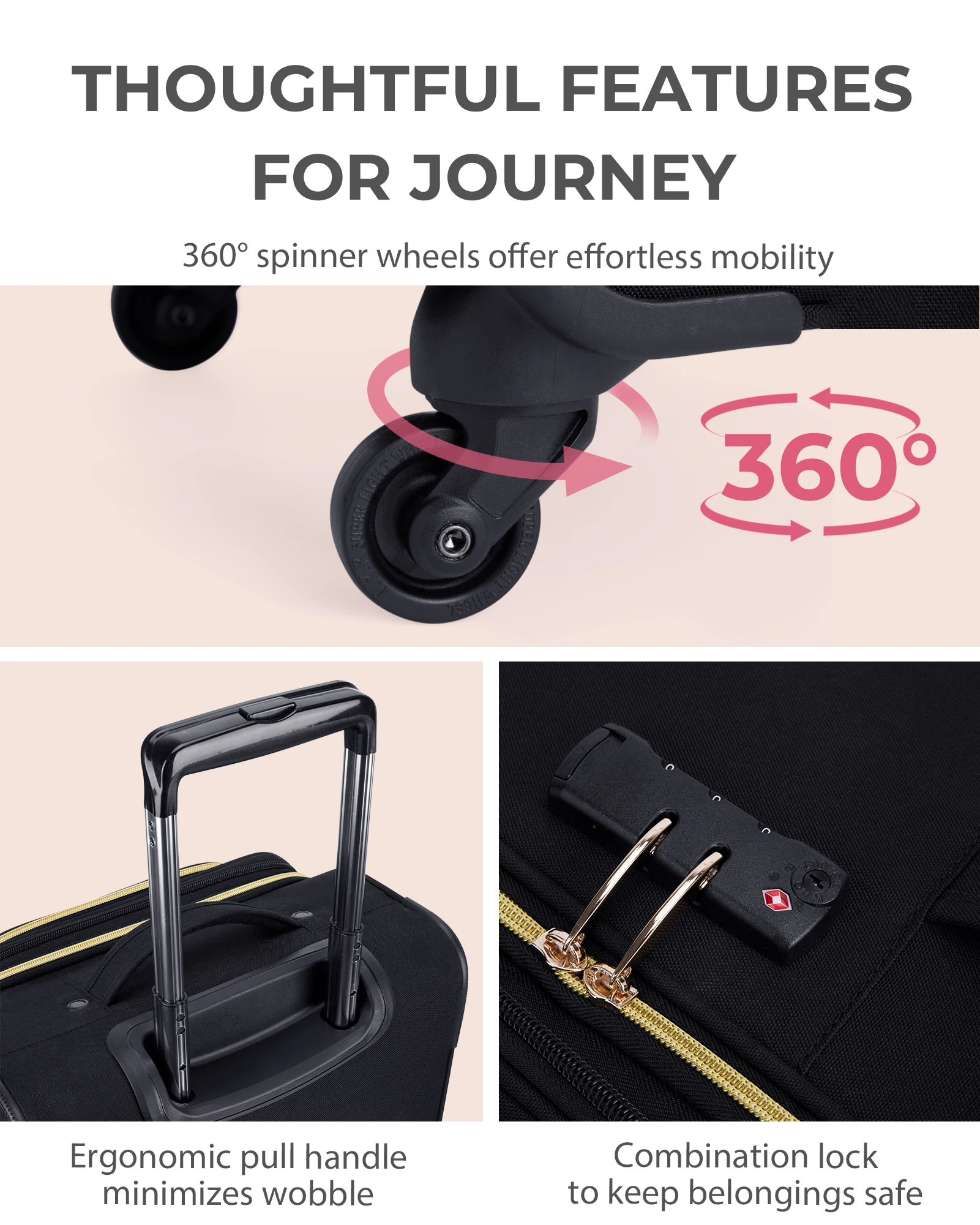 - High Performance-: The 2-step ergonomic high-grade aluminum tube handle, can adjust to multiple heights while minimizing wobble, which offers easy mobility.360° Spinner Wheels- Rolling suitcase with wheels offer a sturdier base for effortless gliding, even when full.