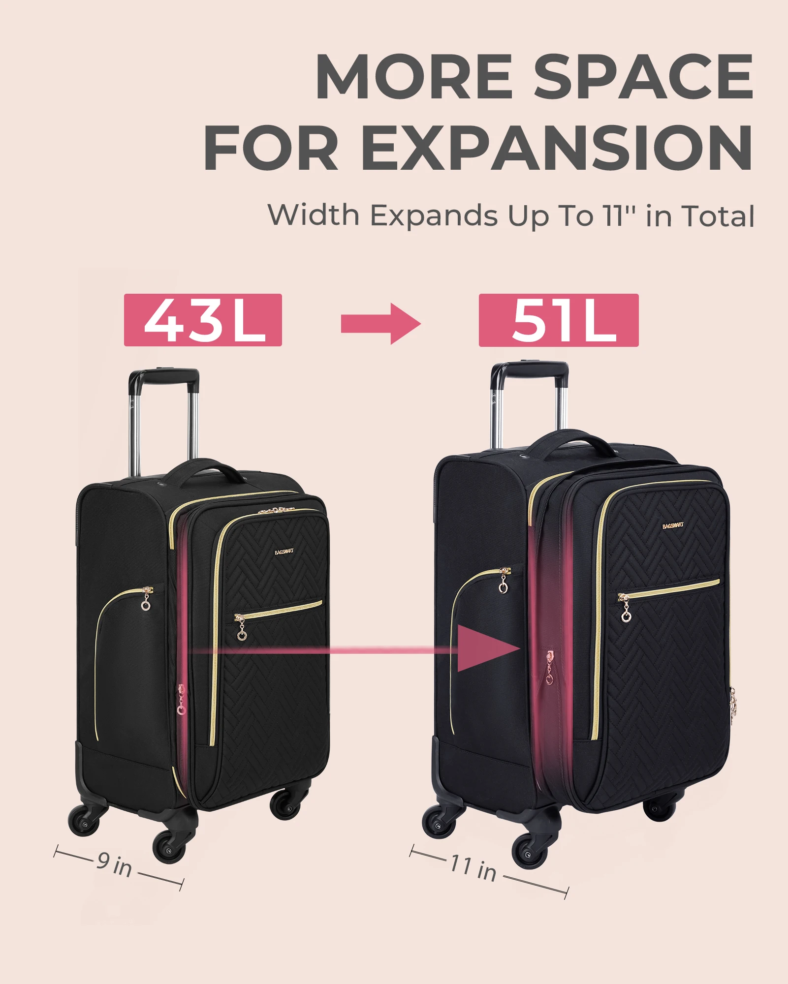 - Pack In More-: Softside expandable suitcase allows for additional 2" of width, offering 43L and extra 8L expansion capacity for all sizes. With the remarkable convenient expandability offering a immense packing capacity to easily fit in 8 T-shirts, 5 pants, 2 coats, 1 pair of shoes and other travel essentials. Women luggage is perfect for 4-7 days train and car trips alike.