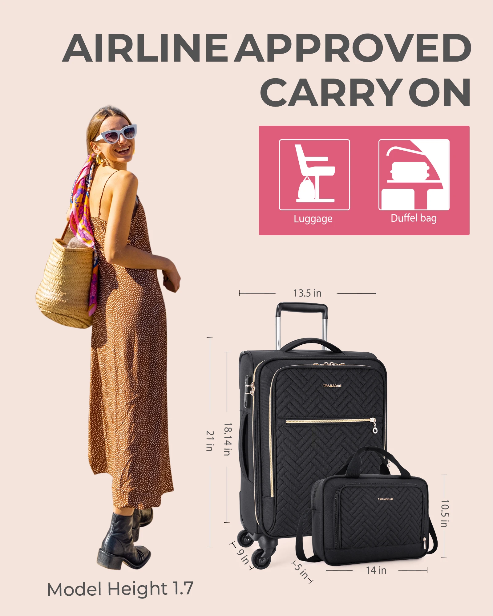 - Airline Approved Carry On-: Suitcase measures 21×13.5×9 inch(Height of wheels included) ,sized to fit in the overhead bin of most major airlines carry-on sizer bin likes American Airlines; Delta Airline; United Airline; Southwest Airline;Hawaiian Airline and Alaska Airline ect. And travel luggage with wheels complies with all published check-in size restrictions for nearly all major airlines.