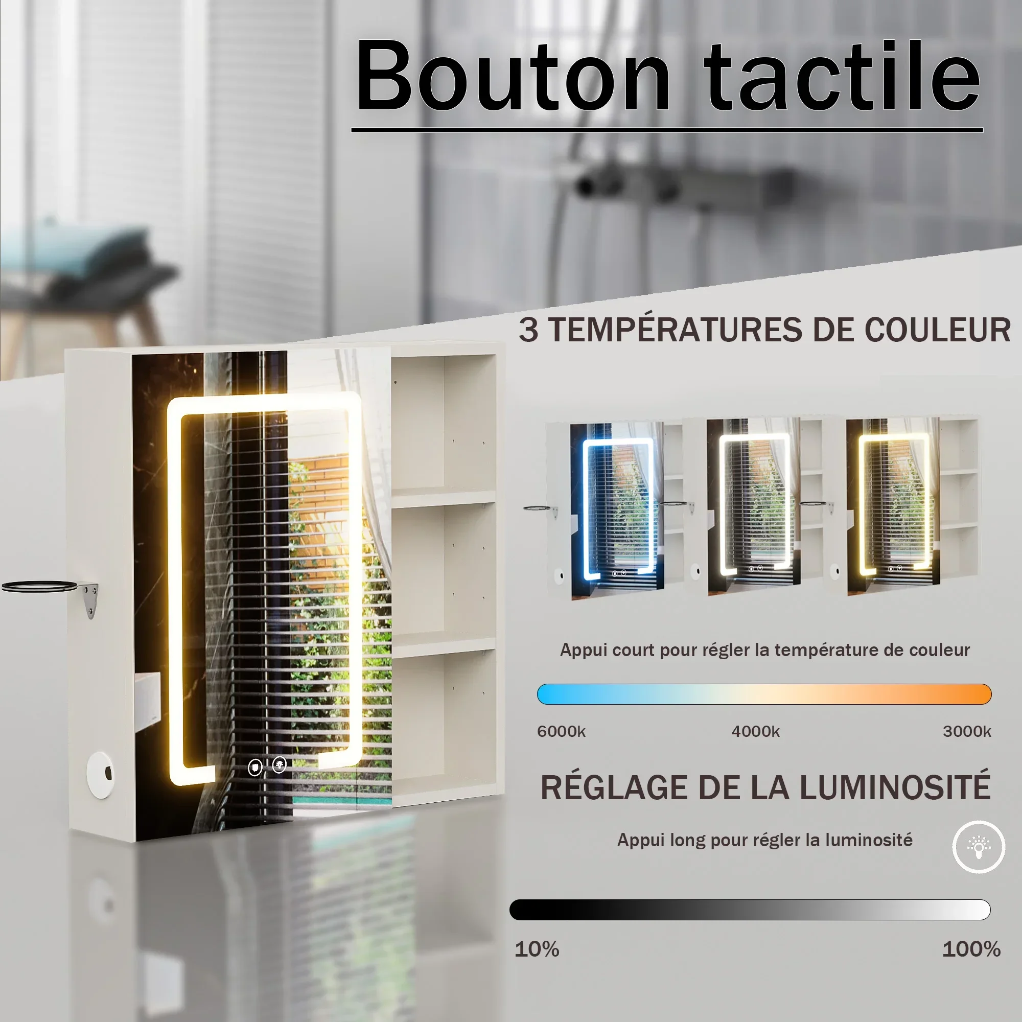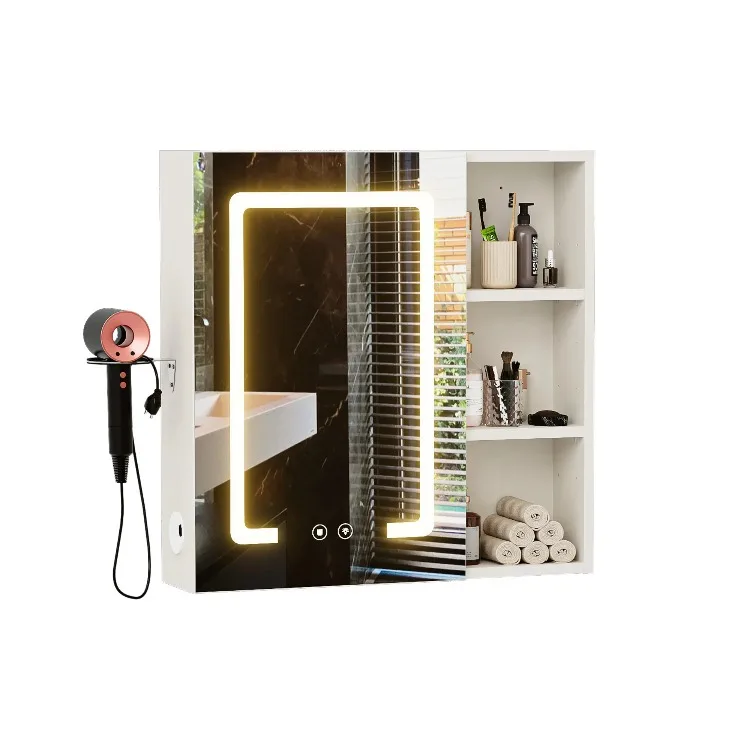 LED Lighting: This bathroom mirror cabinet is designed with three color adjustable LED lights, which are controlled through a touch screen for convenience and efficiency. Perfect for makeup, shaving, or skincare routines, the energy-efficient lights provide optimal brightness without glare.