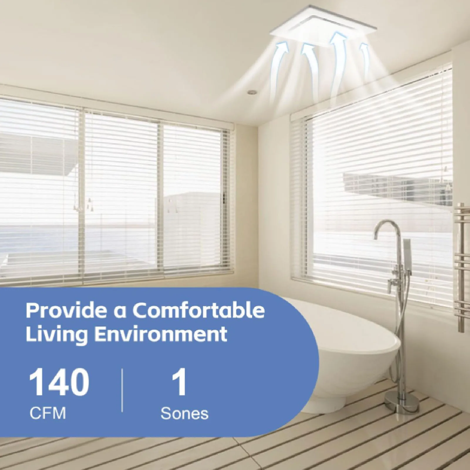2. High Air Flow Rate: With a noise level of 1 sone and an impressive airflow speed of 140 CFM, the exhaust fan is suitable for spaces of up to 100 square feet. Enhance air quality, regulate humidity, and keep your bathroom tidy.