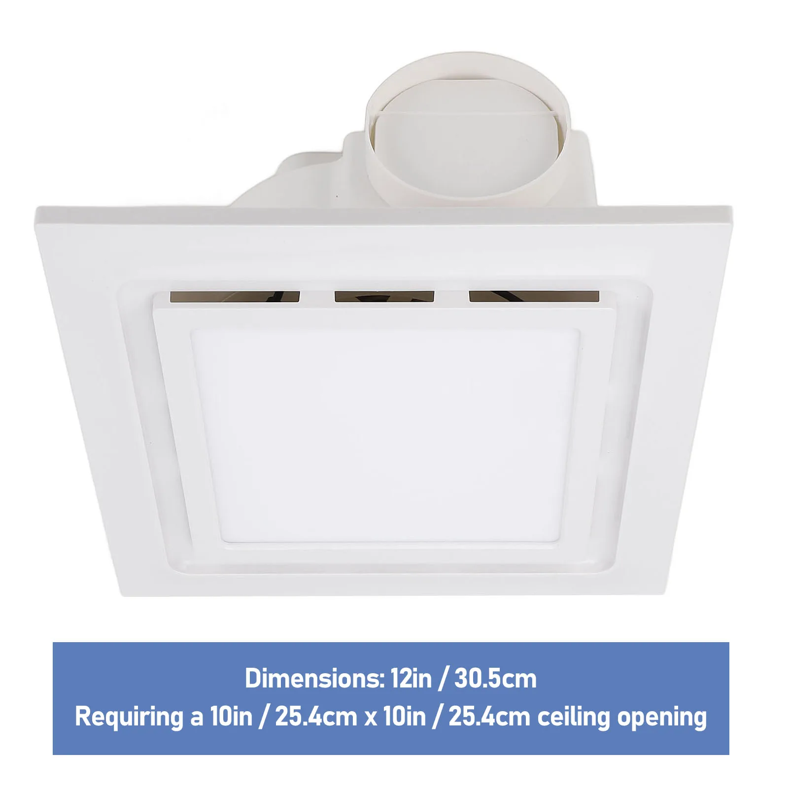 4. Dimensions: The exhaust fan measures 12 inches, requiring a 10 x 10inch ceiling opening. Please be aware that if the existing fan size differs, the ceiling opening size needs to be adjusted to accommodate it.