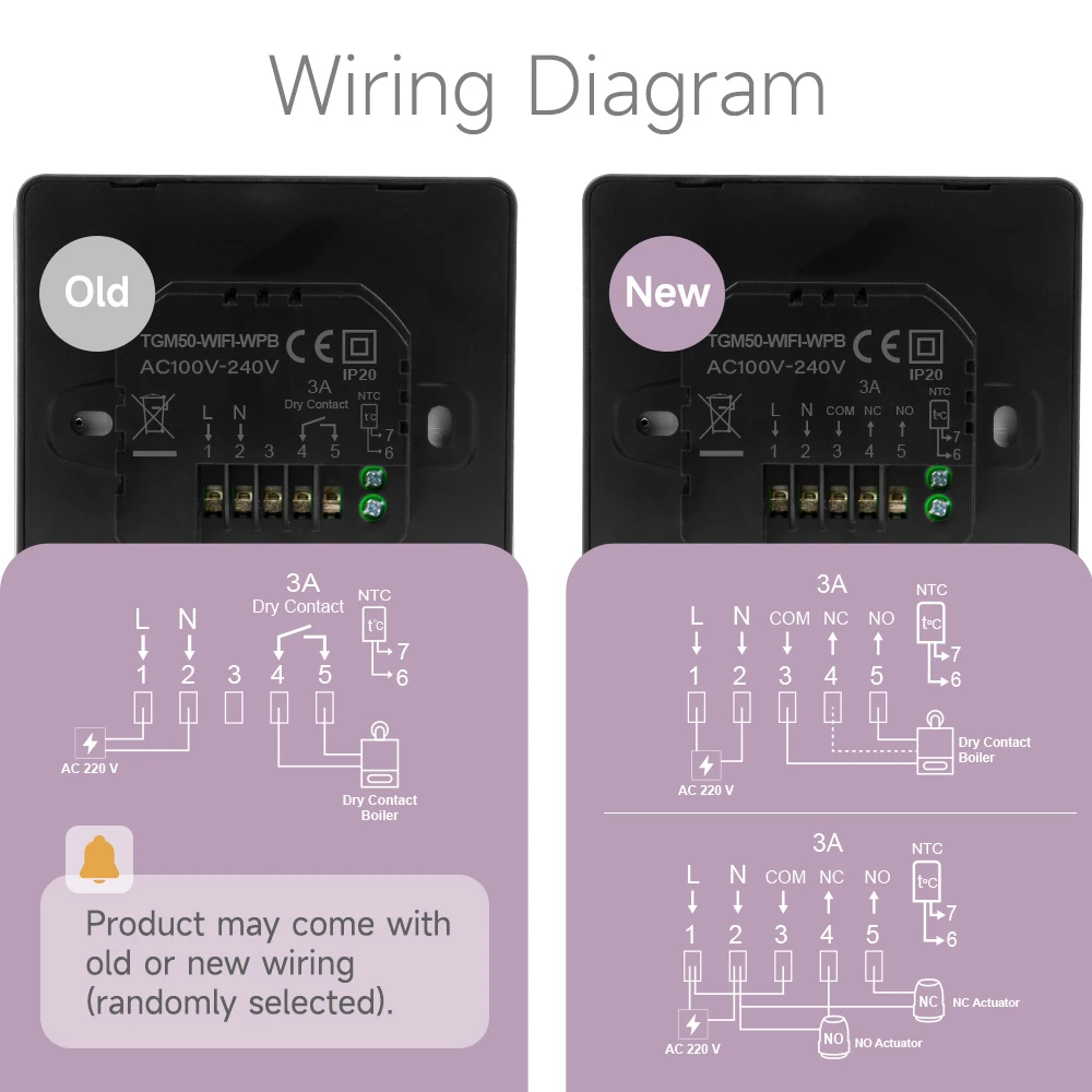 The TOL47WIFI-WPB model currently has two wiring versions, which are shipped randomly. Both the new and old models can be connected to boilers with dry contacts.