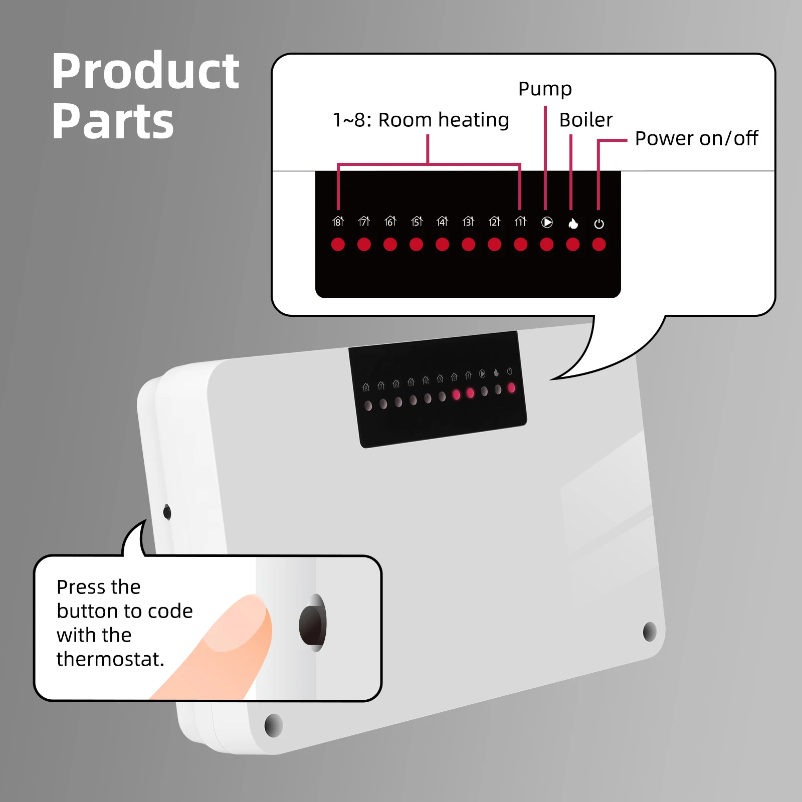 LED1-LED8: Temperature controller output indicator light. When the temperature controller shows heating, The LED light will light up; When the thermostat shows no heating, The LED light will turn off; When the thermostat is pairing, The LED light will flash.