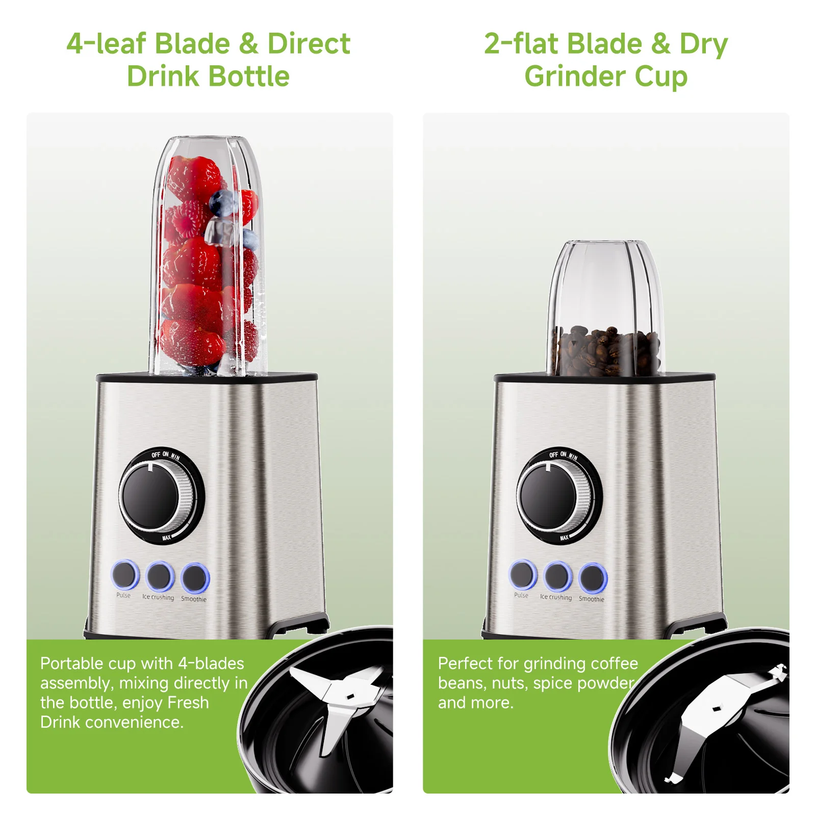 2.VERSATILITY: The 4-blade stainless steel makes smoothies, and frozen drinks in seconds. The 4-blade stainless steel can blend juice. While the flat 2 blades handles dry ingredients like coffee beans, nuts, and seeds. Pulse Function can quick bursts for perfect texture without over-processing.