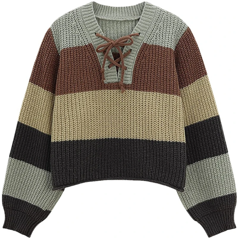 Biyaby Preppy Style V-Neck Sweater for Women Lace-Up Long Sleeve Knitted Pullover Loose Fit Autumn Wear 2025 Ladies Fashion