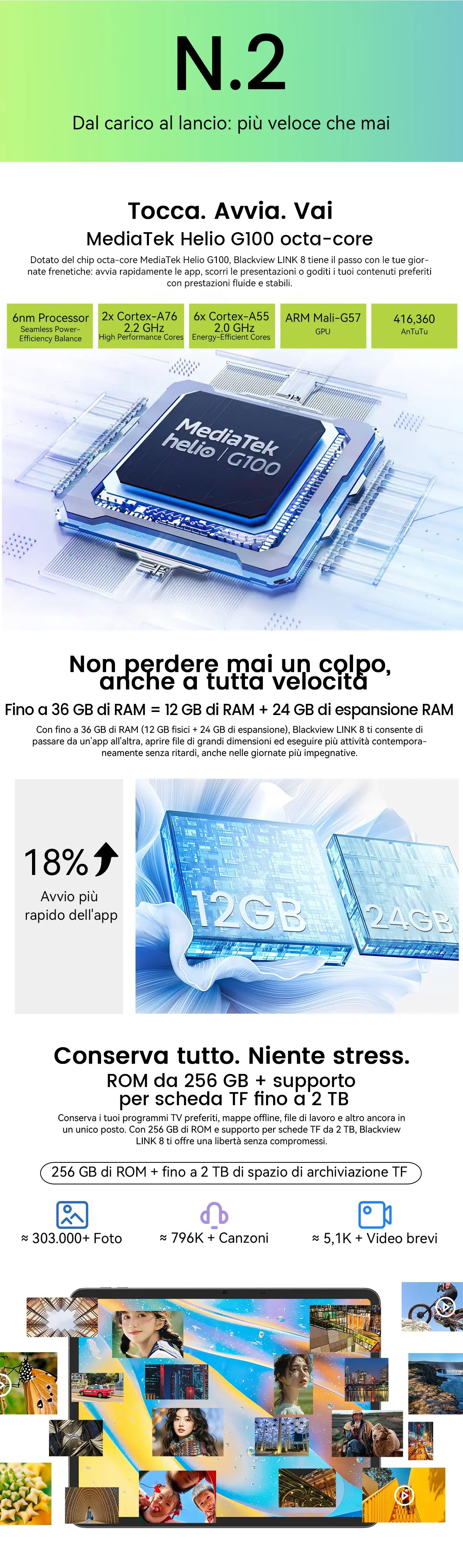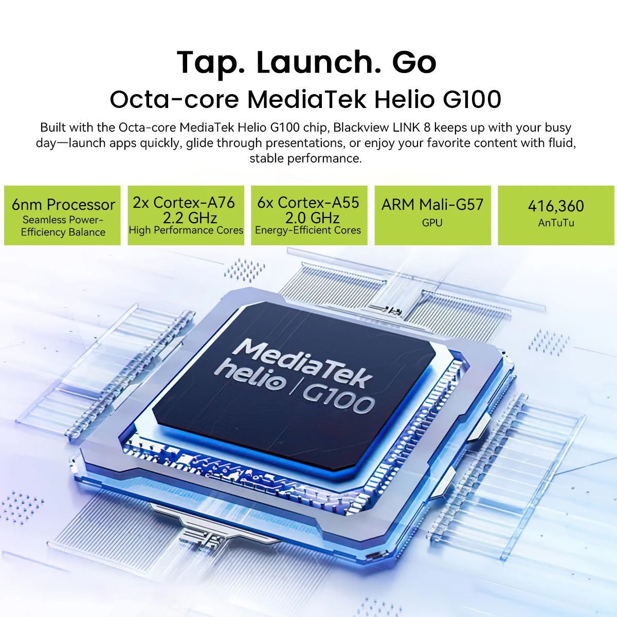 CPU:MediaTek Helio G100, nucleo Octa, fino a 2,2 GHz