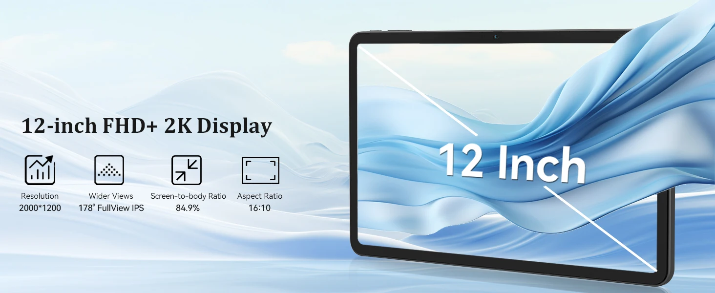 Display: 12-inch,IPS,1200*2000 Resolution,84.9% Screen-to-body Ratio