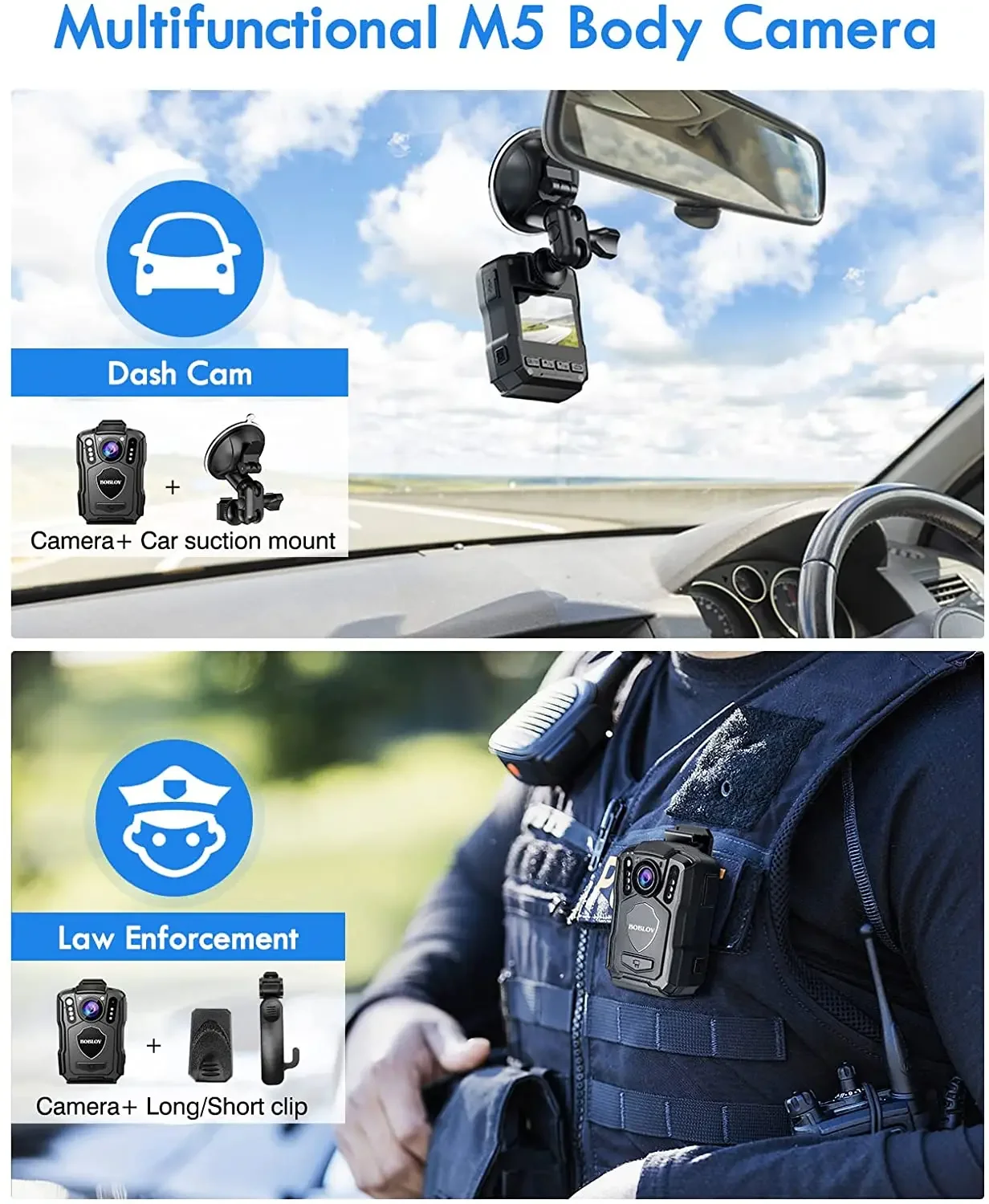【128GB Internal Memory Body Camera Packaging List and Warranty】Package includes 1x M5 body camera, 1x USB cable, 1x short 360° clip, 1x long 180° clip, 1x user manual. BOBLOV provides a two-year warranty for high-value products, with no worry for after-sale.