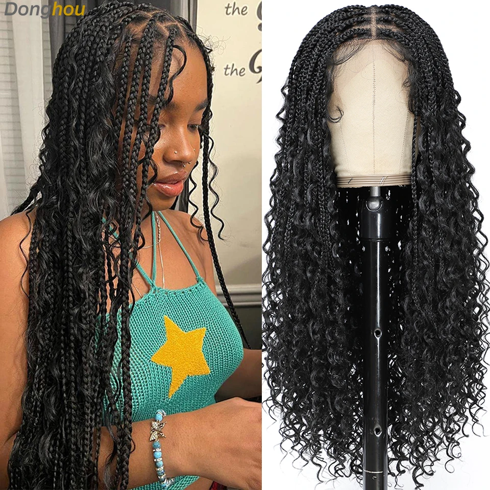 Boho Goddess Box Braid Wig with Baby Hair Lace Front Braided Wigs for Women Brown Hair Synthetic Blended Braids Wig Curly Hair