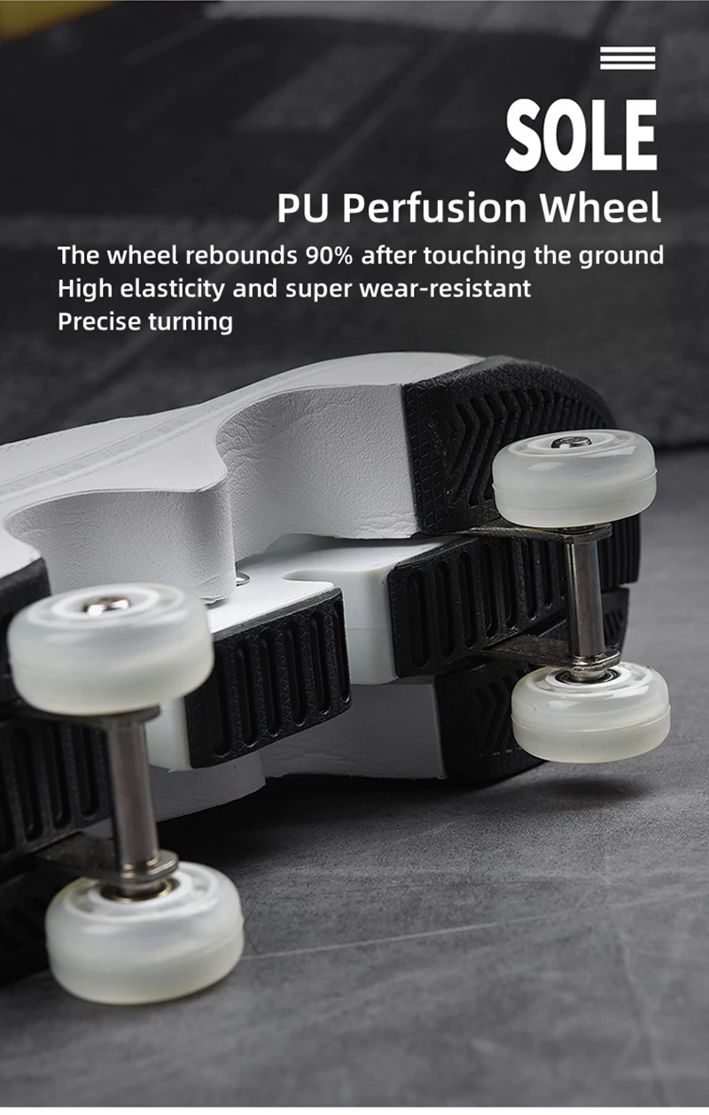 The shoe wheels are made with PU infusion technology, which has high elasticity and super wear resistance. The wheels rebound 90% after contacting the ground, ensuring stability and comfort when sliding. Precision turning technology makes the wheels rotate more smoothly, allowing skaters to easily control the speed and direction of skating.