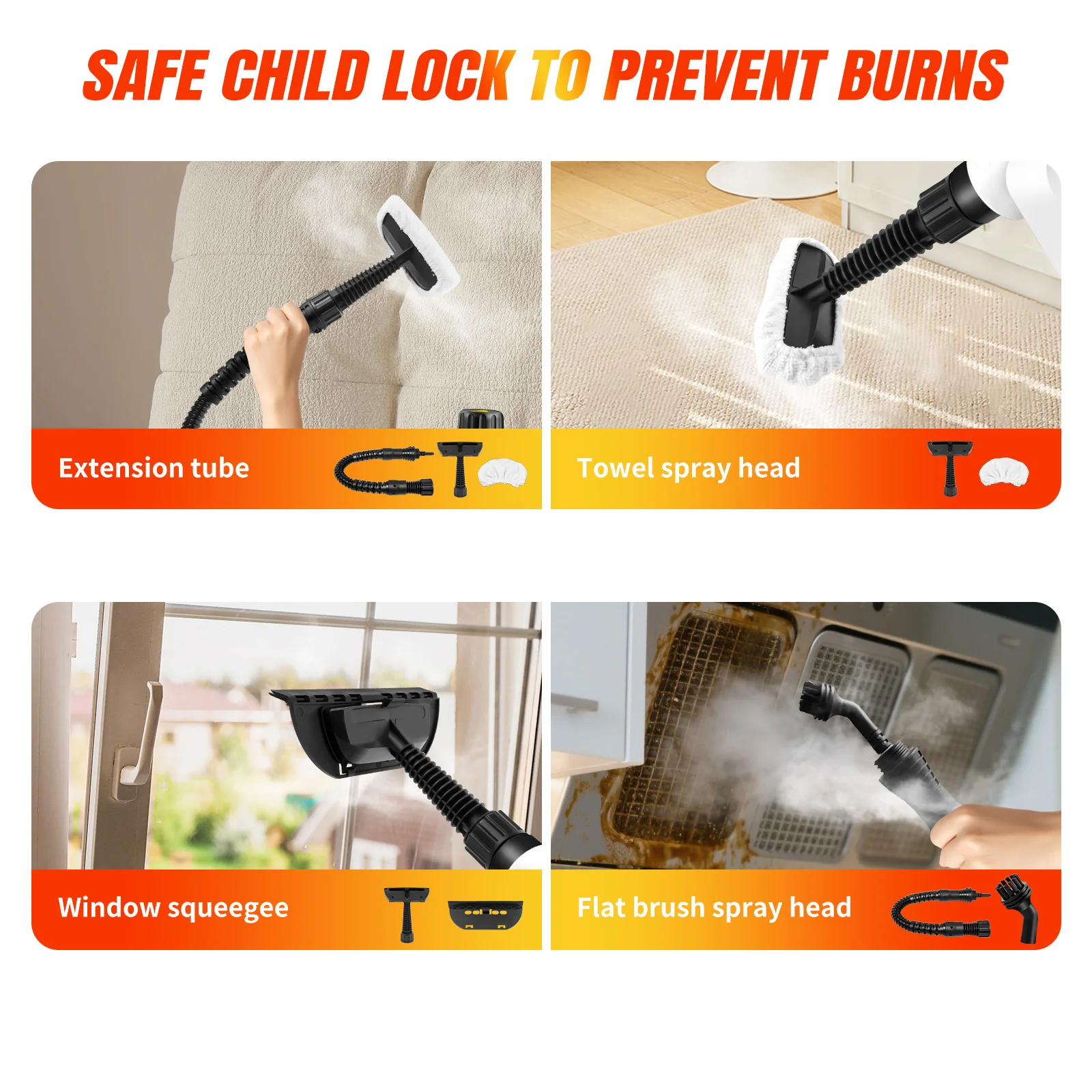 🔥【Chemical-free Safety】: The handheld steam cleaner is 100% free of chemicals and will not produce harmful steam or residues. It has a safety lock on the handle and a safety helmet for additional safety. It can be safely used near children and pets.