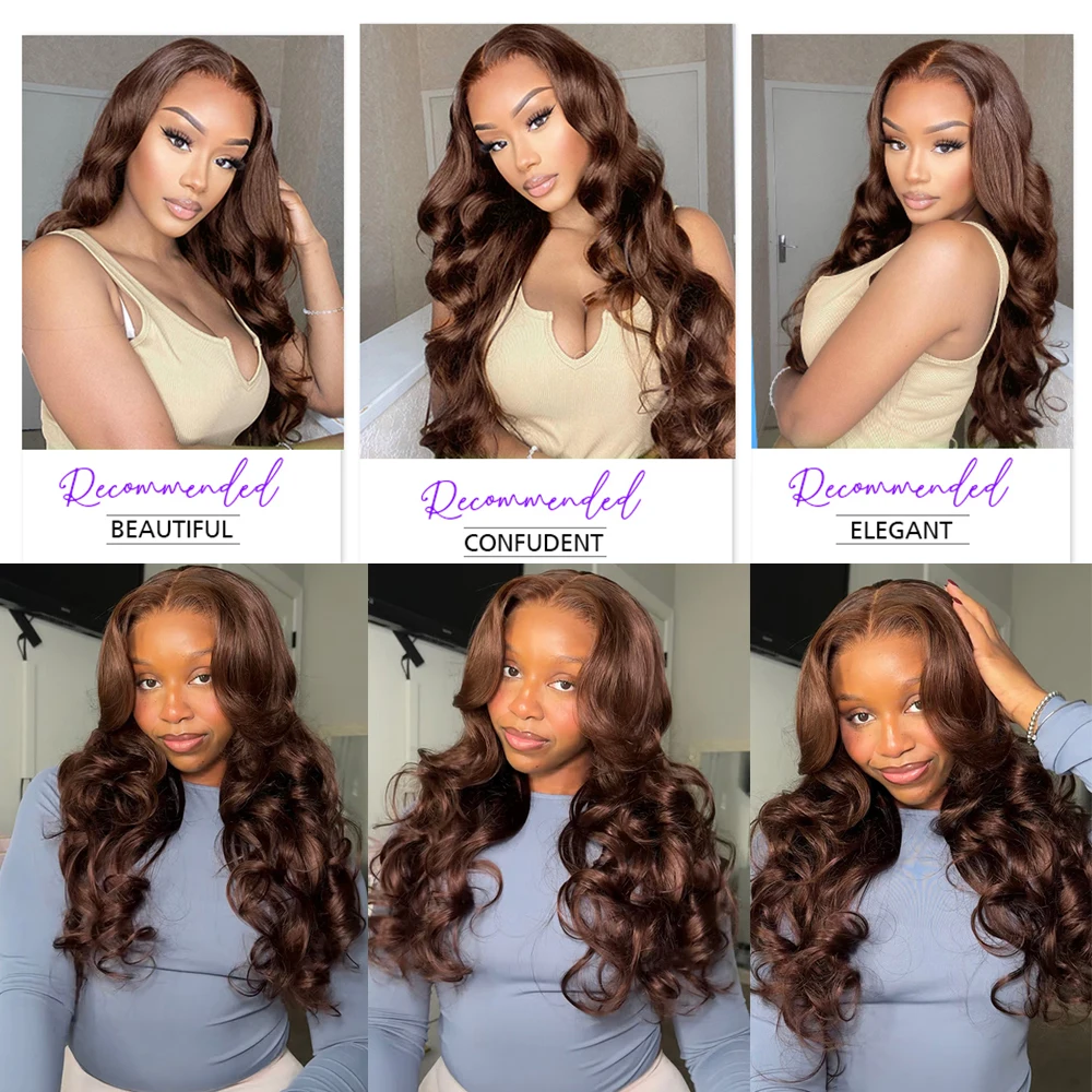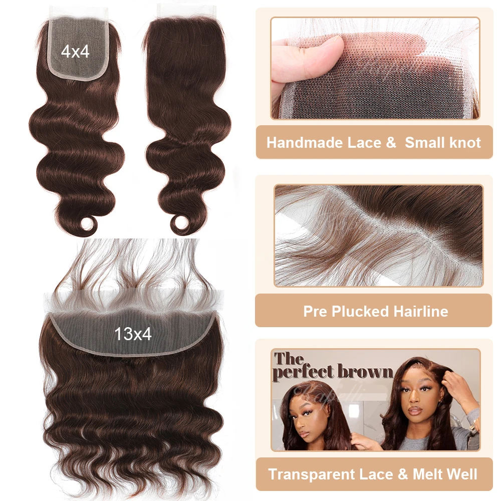 Light Brown Body Wave Bundles with 4×4 HD Transparent Closure Lace Frontal virgin human hair with baby hair, hand-tied swiss lace, match all skin tones, 180% density, no shedding and no tangle; soft and silky, thick and no split ends