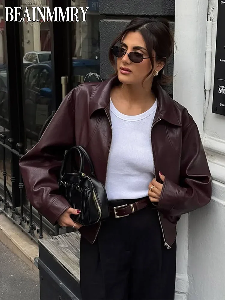 Love this wine-red cropped leather jacket! The zipper details add cool edge while the rich color keeps it chic.visually, the textures are similar, but this short coat is softer.