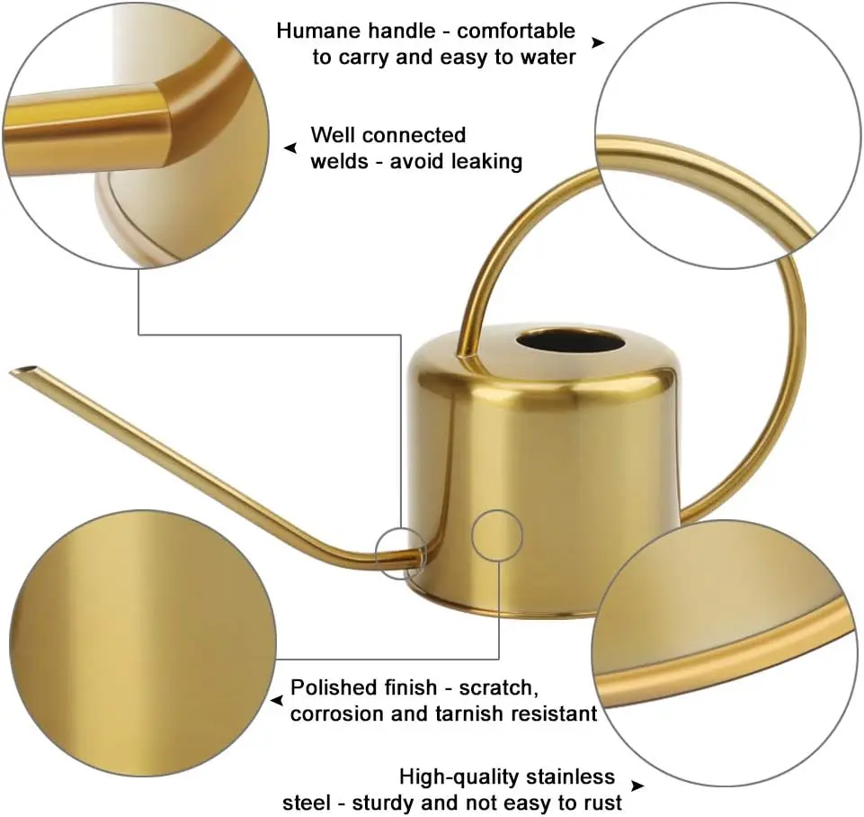 Made of solid 201 stainless steel material to be durable and rust free. With a gold colored coating, stainless steel watering pot has a very nice polished finish that hasn’t spotted, stained or worn off to date. With a capacity of 1.3 liter(40 oz) and comfortable rounded handle, this watering pale is easy to carry and pour on your hand and wrist, especially for those arthritic hands. Top opening design provides easier access to fill the water. The bottom of the long spout waterer is raised and not easy to scrape in daily use. The long-stem spout with the protective cap allows you to control the water flow to your plants and make it easier to water those hard to reach places. The long spout watering pot is both functional and decorative. It is not only a great garden helper, but a great gift for your family members and friends as a home decoration.