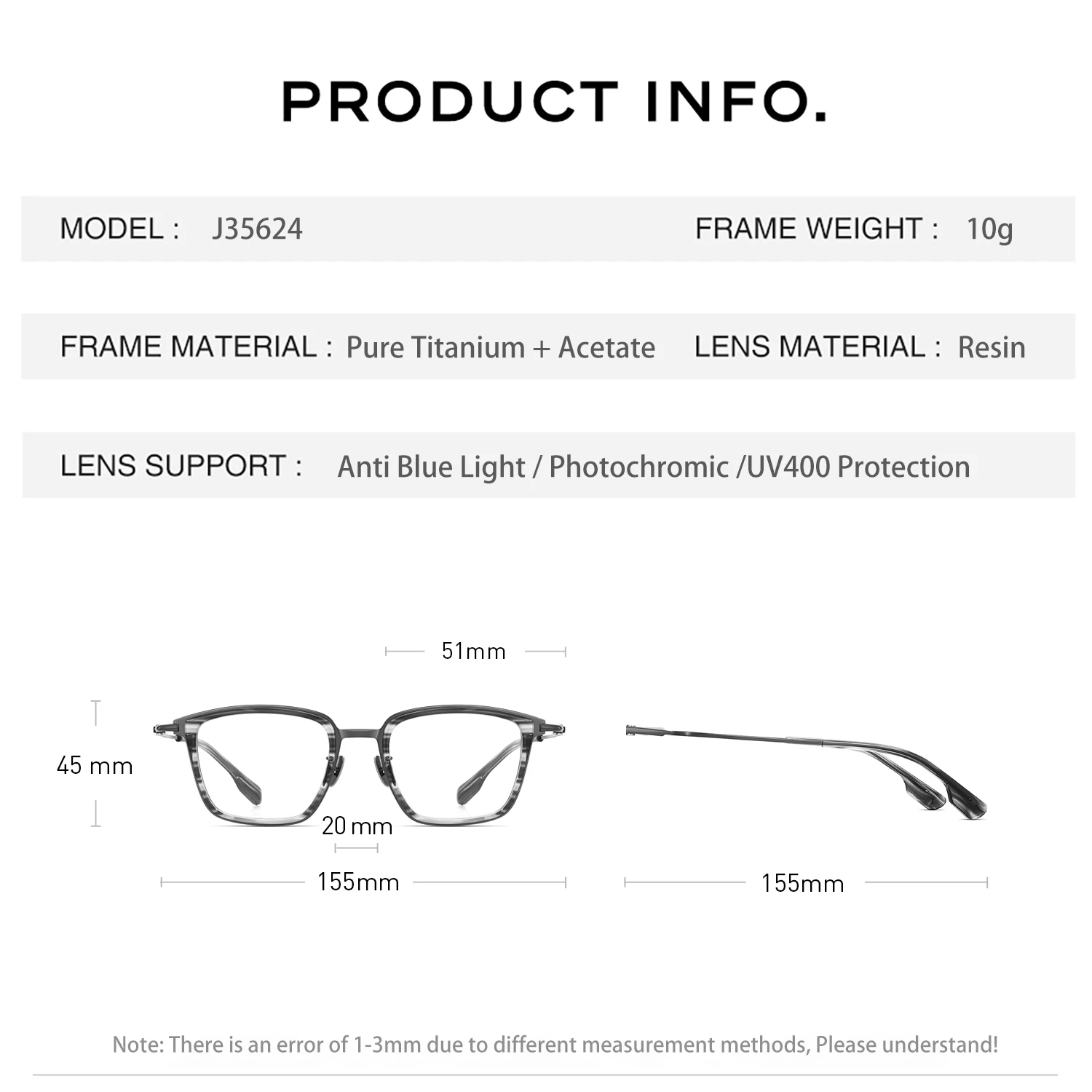 - Frame material: Pure titanium+Acetate
