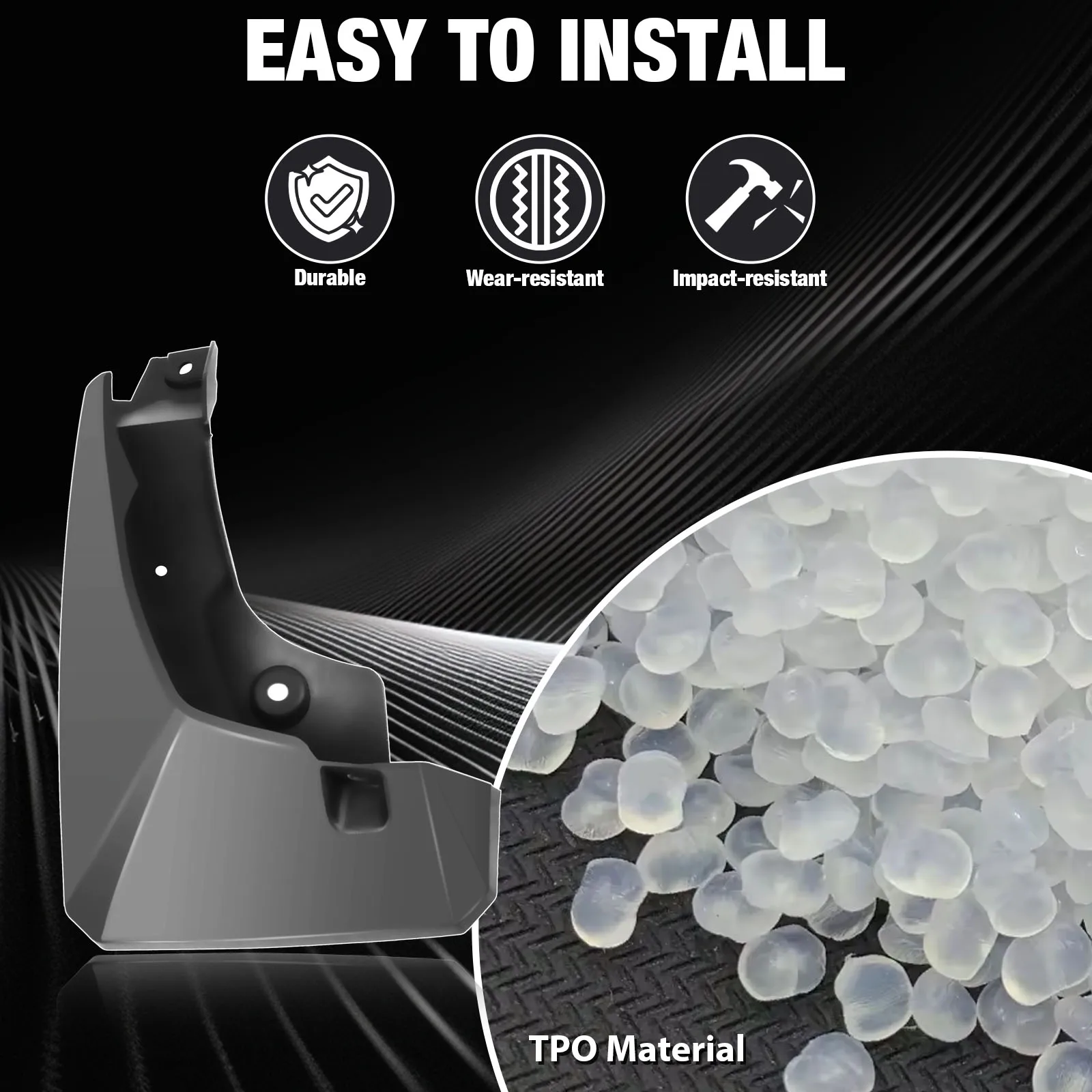 Material: High Grade TPO Plastic. Molded Splash Guards.