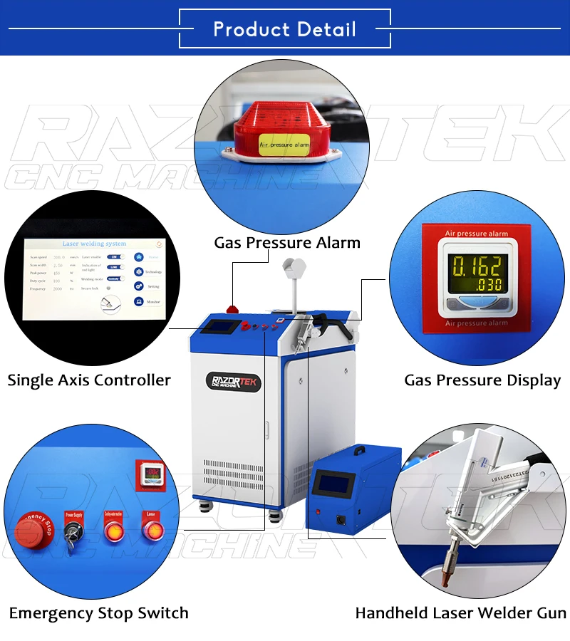 Razortek laser welding machine Application in Stainless steel, Carbon steel, Aluminum, Copper materials, etc. Beautiful weld, fast speed, no consumables, no welding mark, no discoloration, no need to polish later. Can be configured with a variety of Angle nozzle to meet the welding needs of different products.