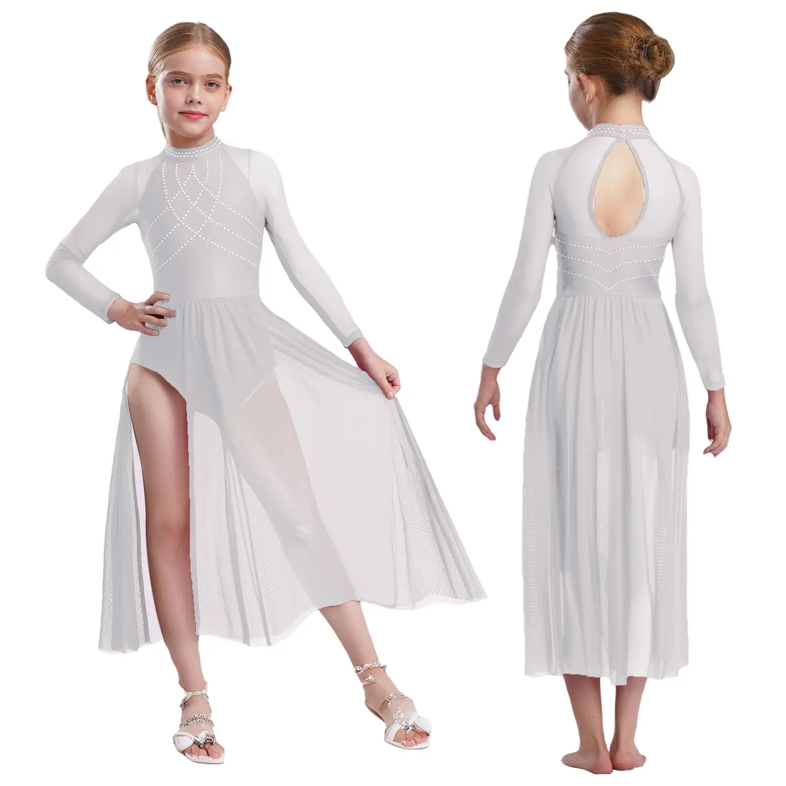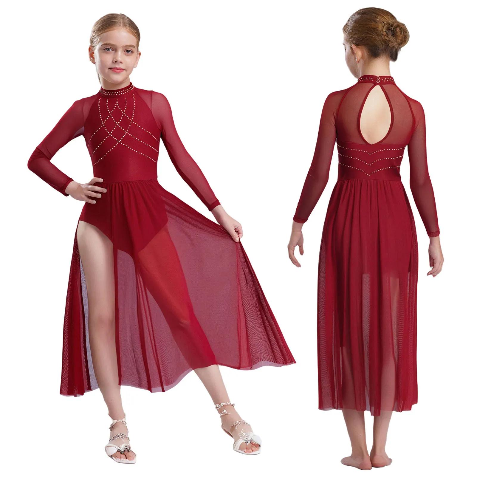 Chic lyrical dance dress for girls with rhinestones on the bodice, sheer mesh sleeve design.