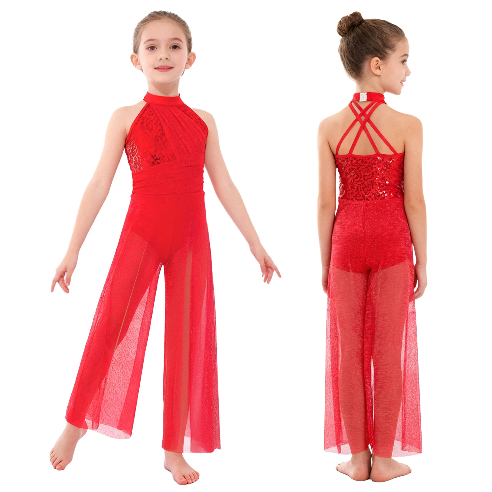 The split wide-leg bodysuit style is fashionable and comfortable, suitable for lyrical dance performances, dance classes, recitals, or other special occasions.