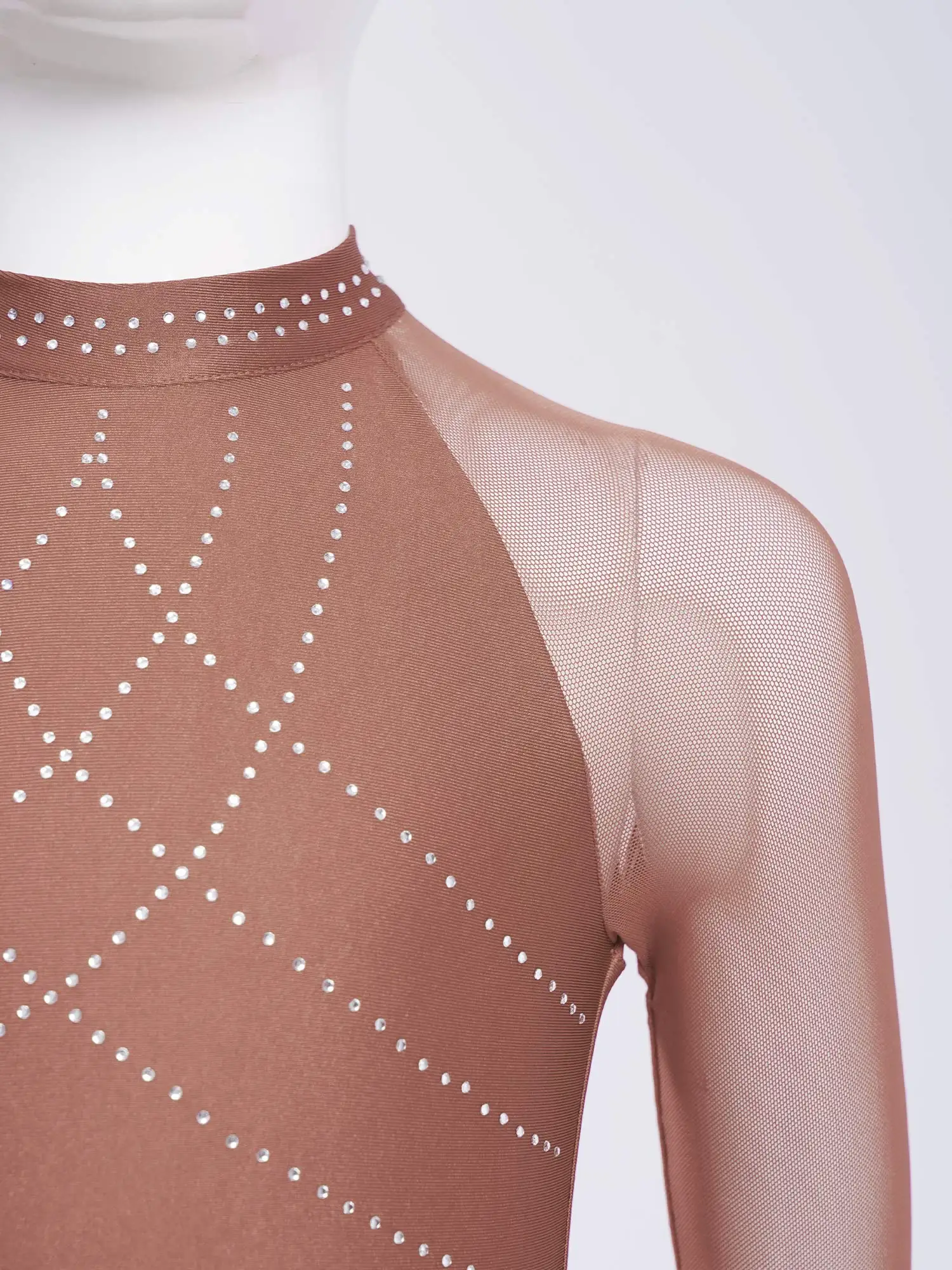 The shiny sequins bodice and shimmery mesh bottom create a dazzling effect under the stage lights, enhancing the performance atmosphere.