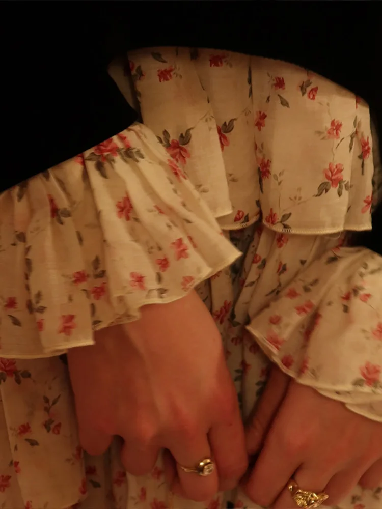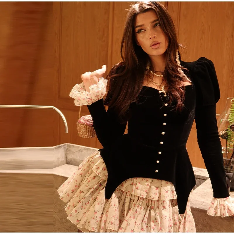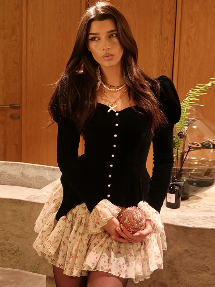 A dress that catches your heart at a glance! The combination of velvet and print is too high-end, making the upper body look thin and elegant. The fabric has a good drape and is not bulky, and the workmanship is exquisite