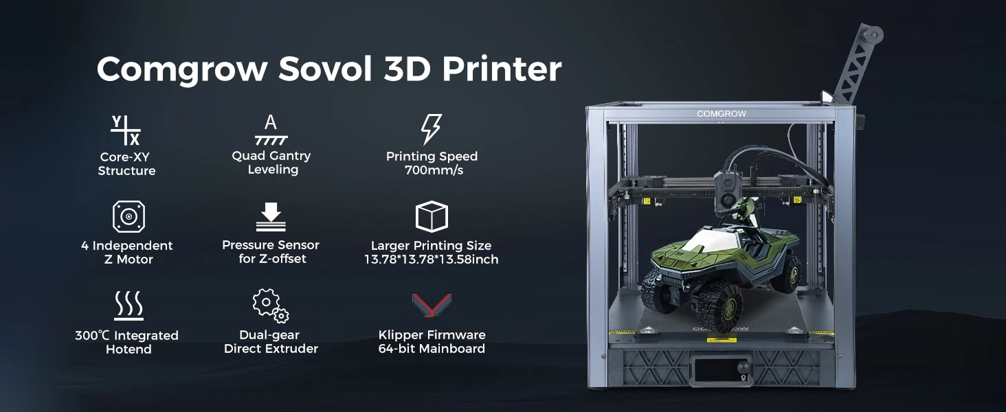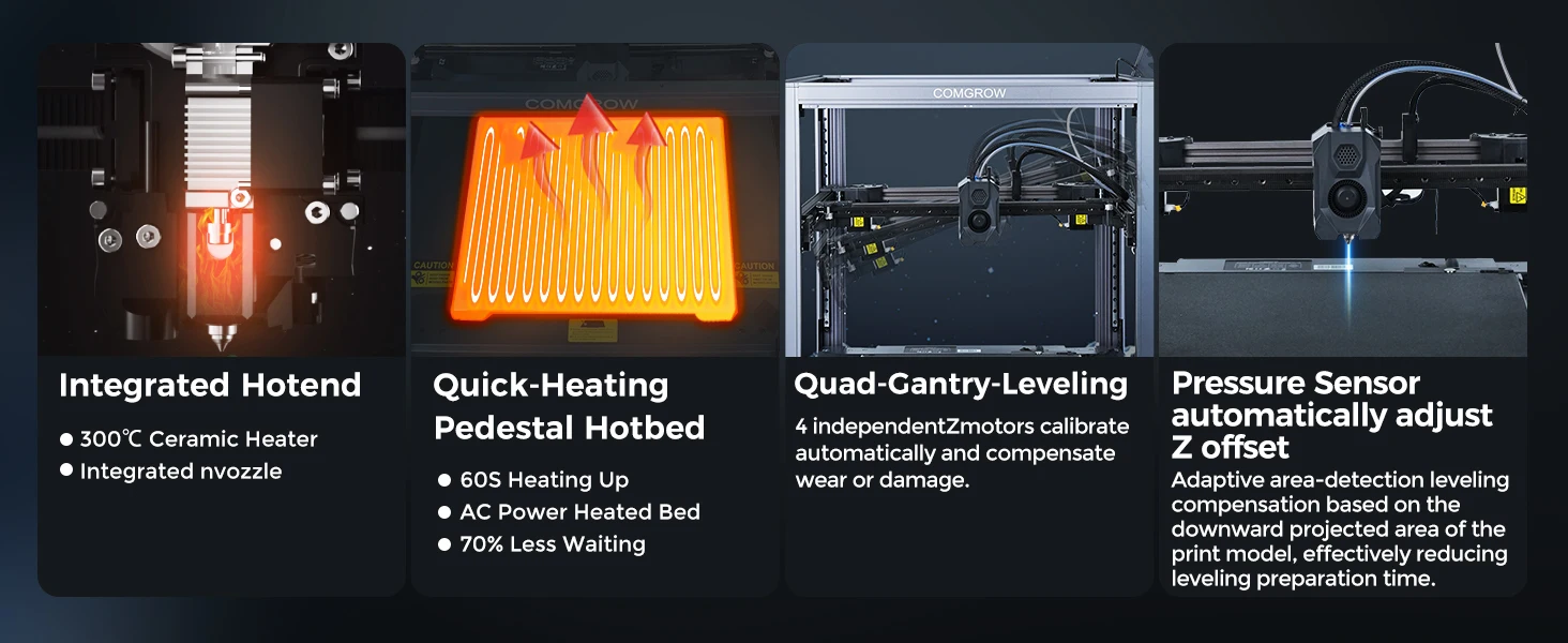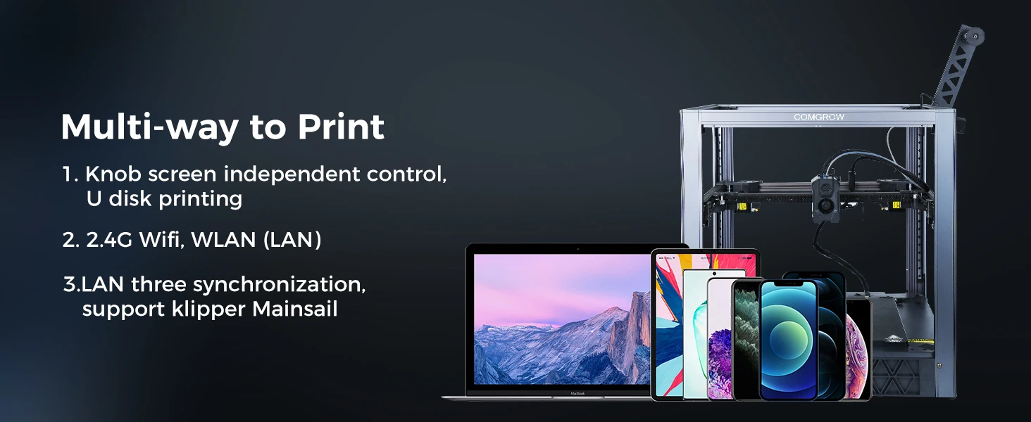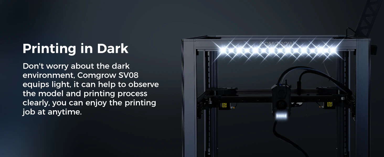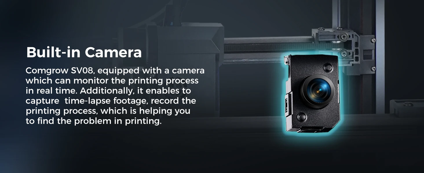 SV08 quick-heating pedestal hotbed with AC power can fulfill 60s heating up, , The XYZ linear rails improve precision and resistance for movement deformation. Comgrow SV08, equipped with a camera which can monitor the printing process in real time. Additionally, it enables to capture time-lapse footage, record the printing process, which is helping you to find the problem in printing. Also, simply connects SV08 to your LAN using 2.4G WiFi or an Ethernet port enables convenient interaction with your printers and grants access to a range of features