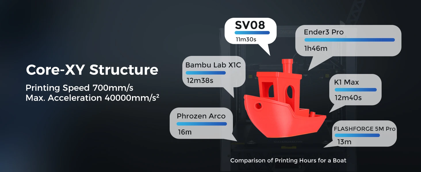 Comgrow SV08 3d printer can print at up to speed 700mm/s with acceleration 40000mm/s², faster than most of printers on the market. It utilizes CoreXY kinematics to decrease moving mass and enhancemotion control. You can complete models efficiently, saving time to wait for print jobs. Moreover, it can keep good printing quality at the same time. And also, it is easily to assemble it, modular assembly helps you save time