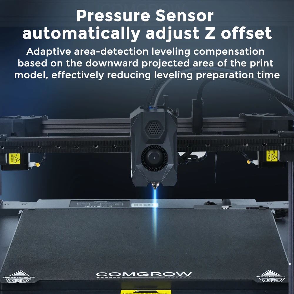 SV08 equips four independent Z motors calibrate automatically and compensate wear or damage. Also, it comes with the pressure sensor which can automatically adjust the Z offset. Adaptive area-detection leveling compensation based on the downward projected area of the print model, effectively reducing leveling preparation time