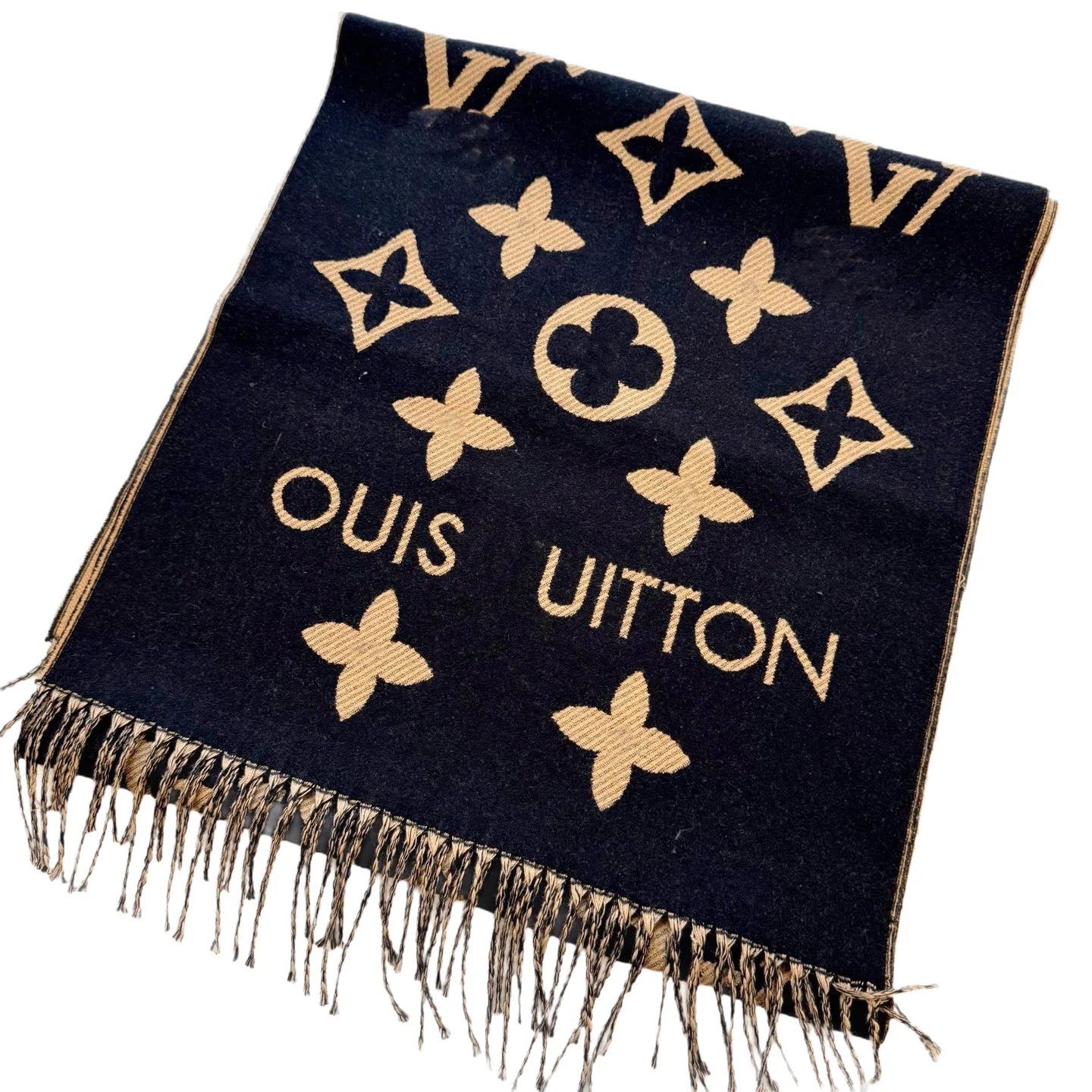 Gorgeous scarf. Beautiful soft stretch material. Soft to touch. Will definitely be ordering more of these scarfs. The logo is 10:10 perfect. It also had a lv label on the inside. The logo is big and bold.