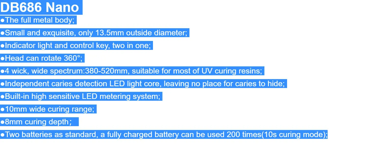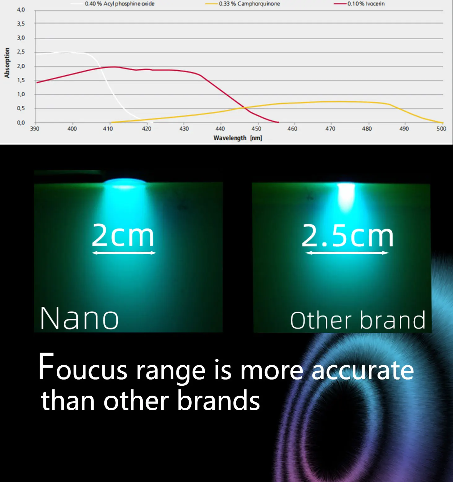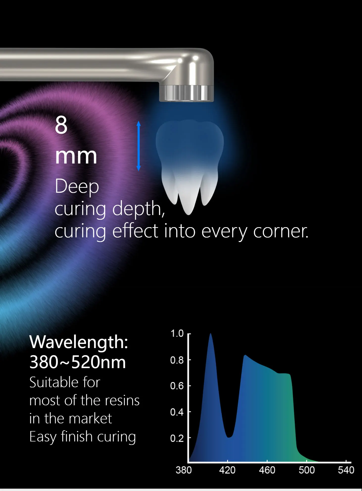 Wavelength 380-520nm Suitable formost of the resinsin the market Easy finish curing |