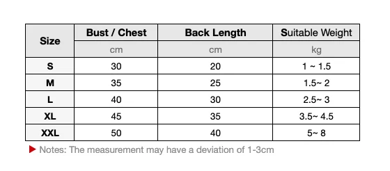 Excellent vest, good quality! Fits perfectly on a 3 kg Chihuahua.