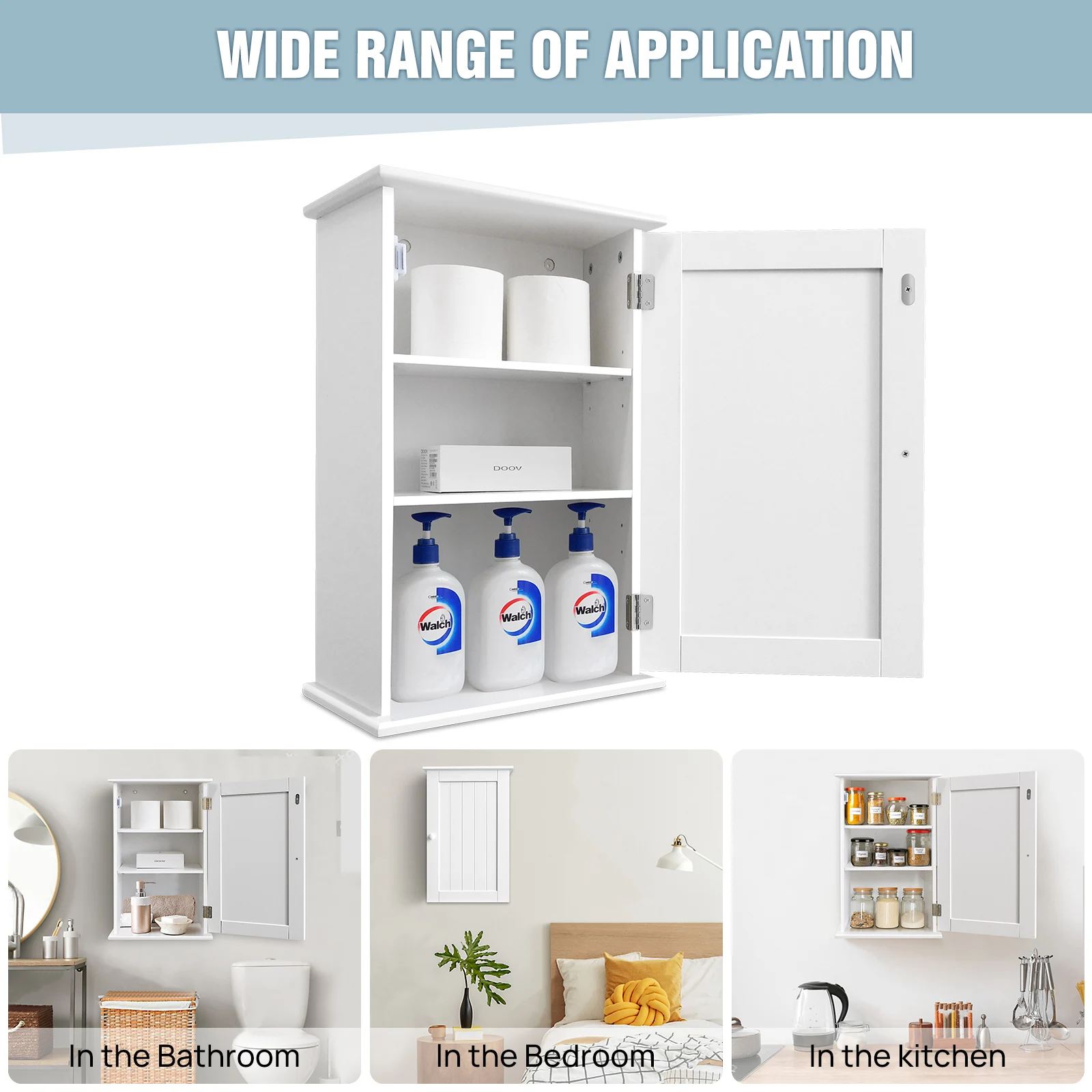 WIDE USE: This wall cabinet can be used in bathrooms, kitchens, laundry rooms, utility rooms, offices or storage rooms for storing and organising hygiene products, cups, plates, dishes, toiletries, medicines, tools, cosmetics and more.