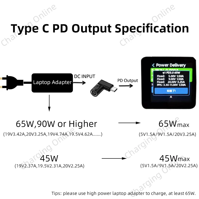 Tips: The input power must be ≥ the output power. Please use 65w or higher power female laptop adapter to charge, then the type c output power will arrive to 65W. Please check carefully before making order.
