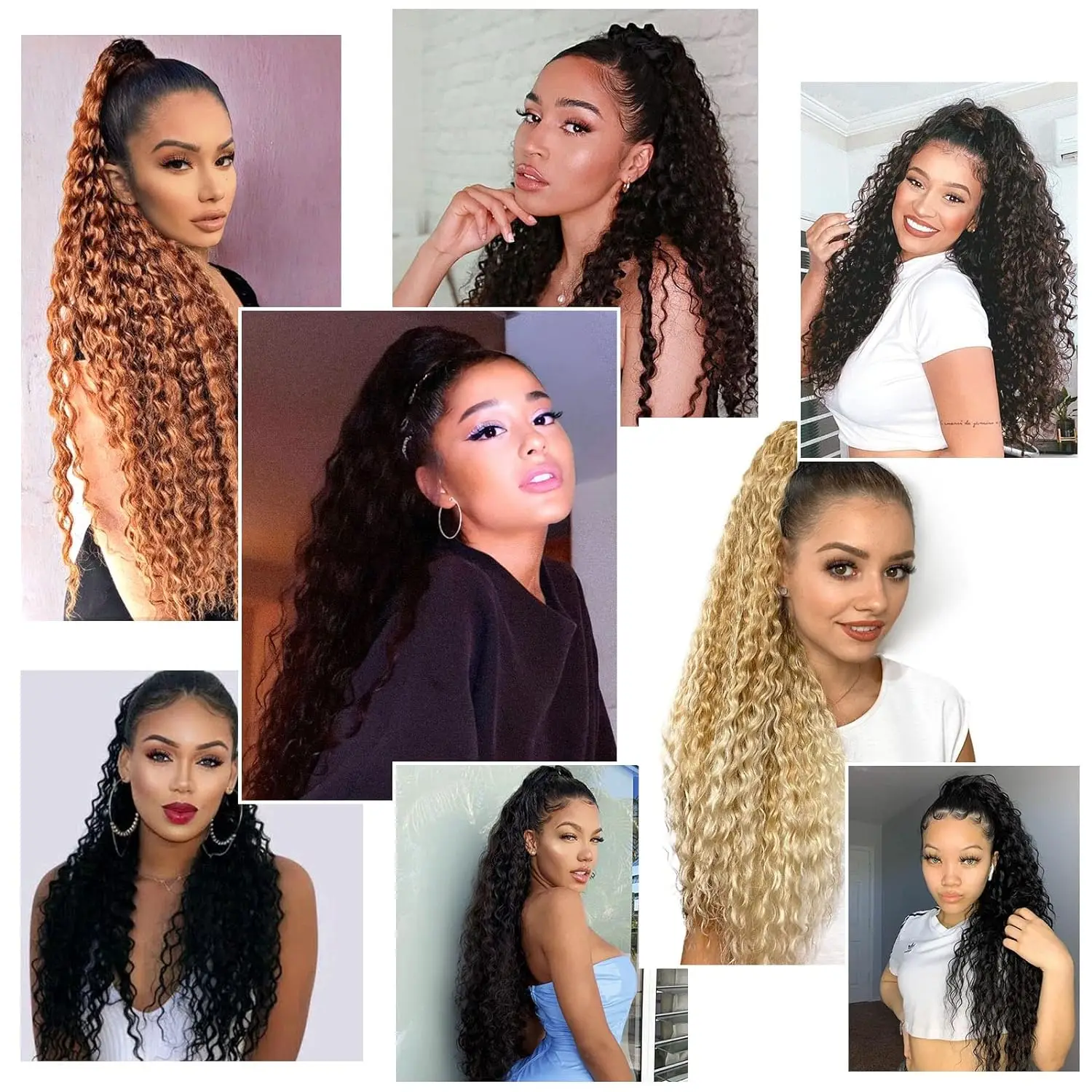 Deep Wave Ponytail 26 Inch Water Curly Drawstring Ponytail Extensions For Women Natural Color Clip On Ponytail Hair Hairpiece