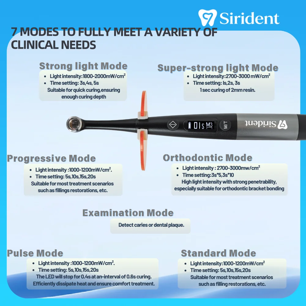 Our dental curing light offers 7 specialized modes to adapt perfectly to various procedures: