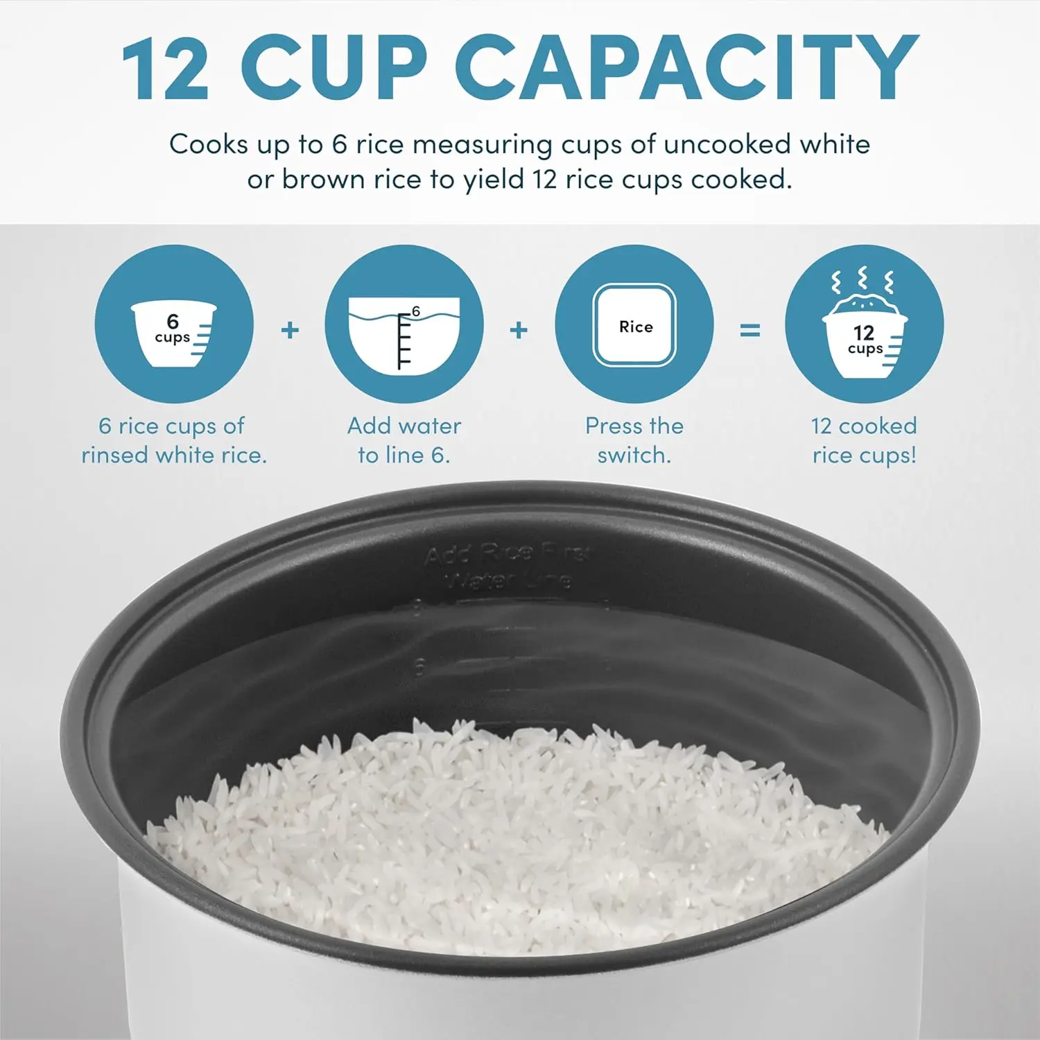 Perfectly prepares 2 to 12 cups of any variety of cooked rice or grains