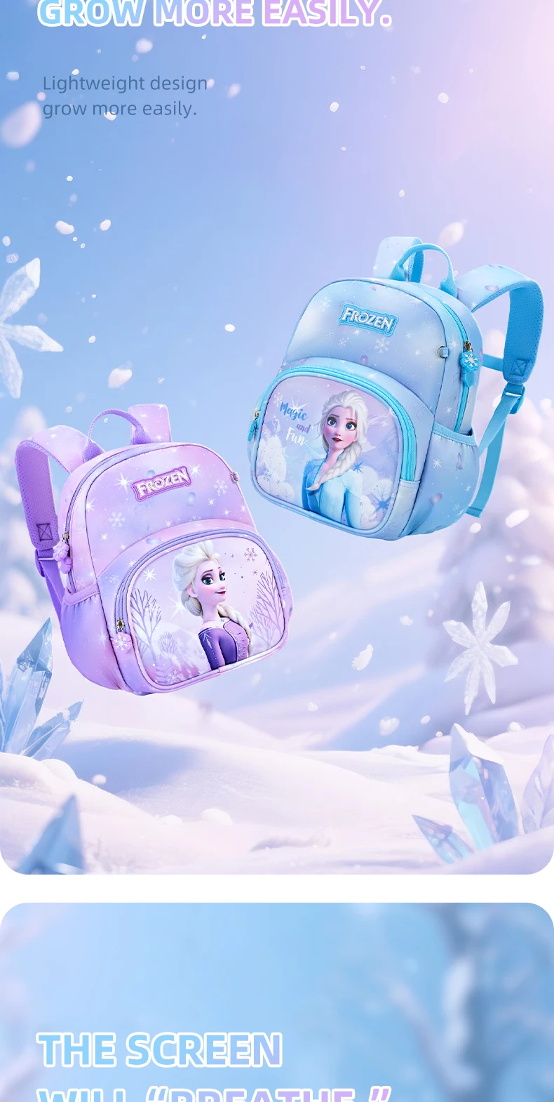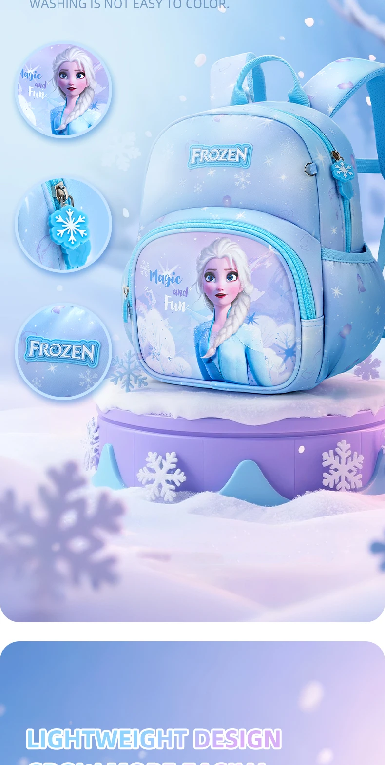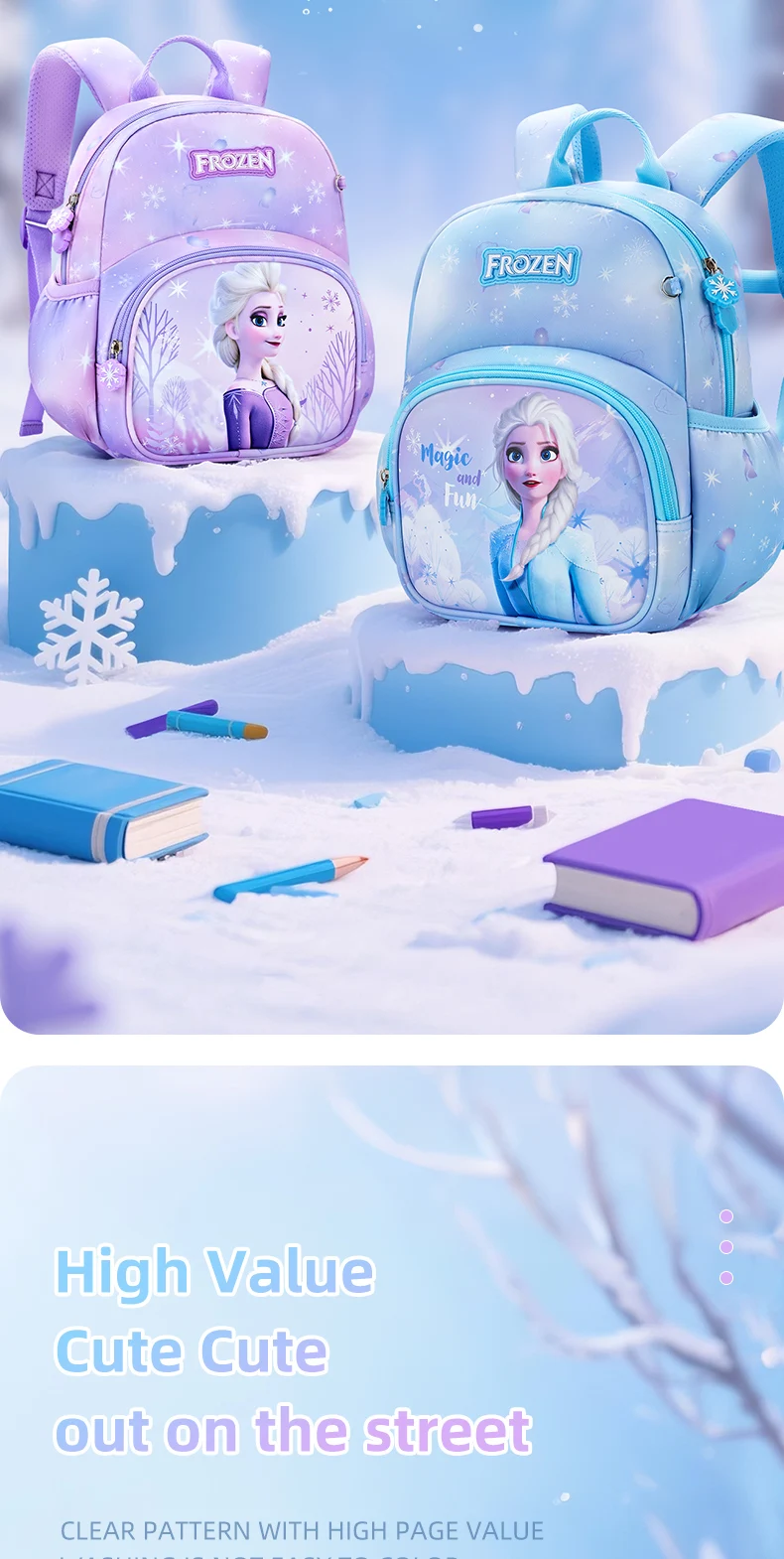 Magical Frozen Design: Vibrant Elsa prints + cute snowflake zipper charms, available in 2 dreamy colors (light blue/pastel purple) to match every little one’s style.