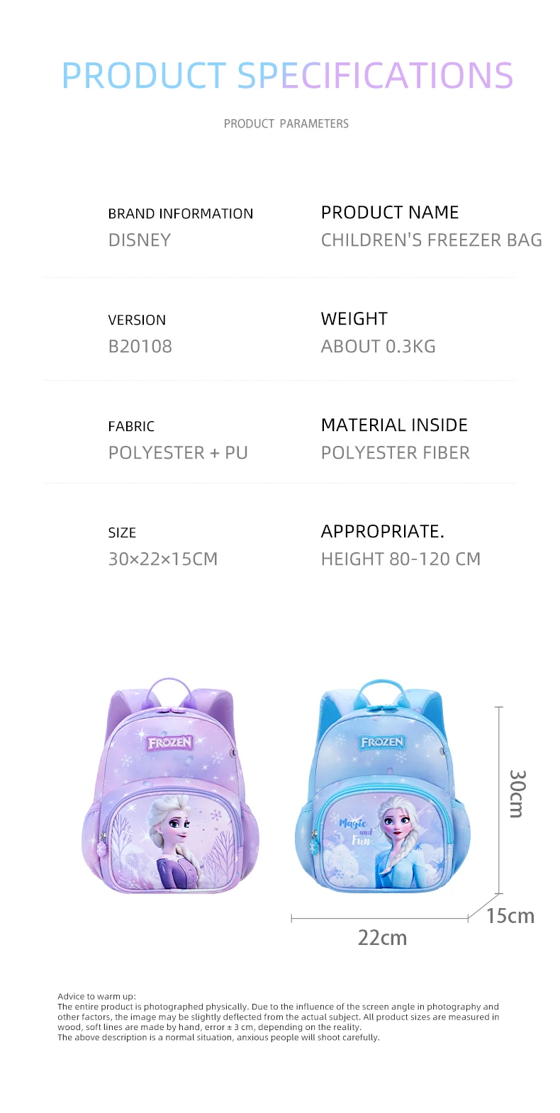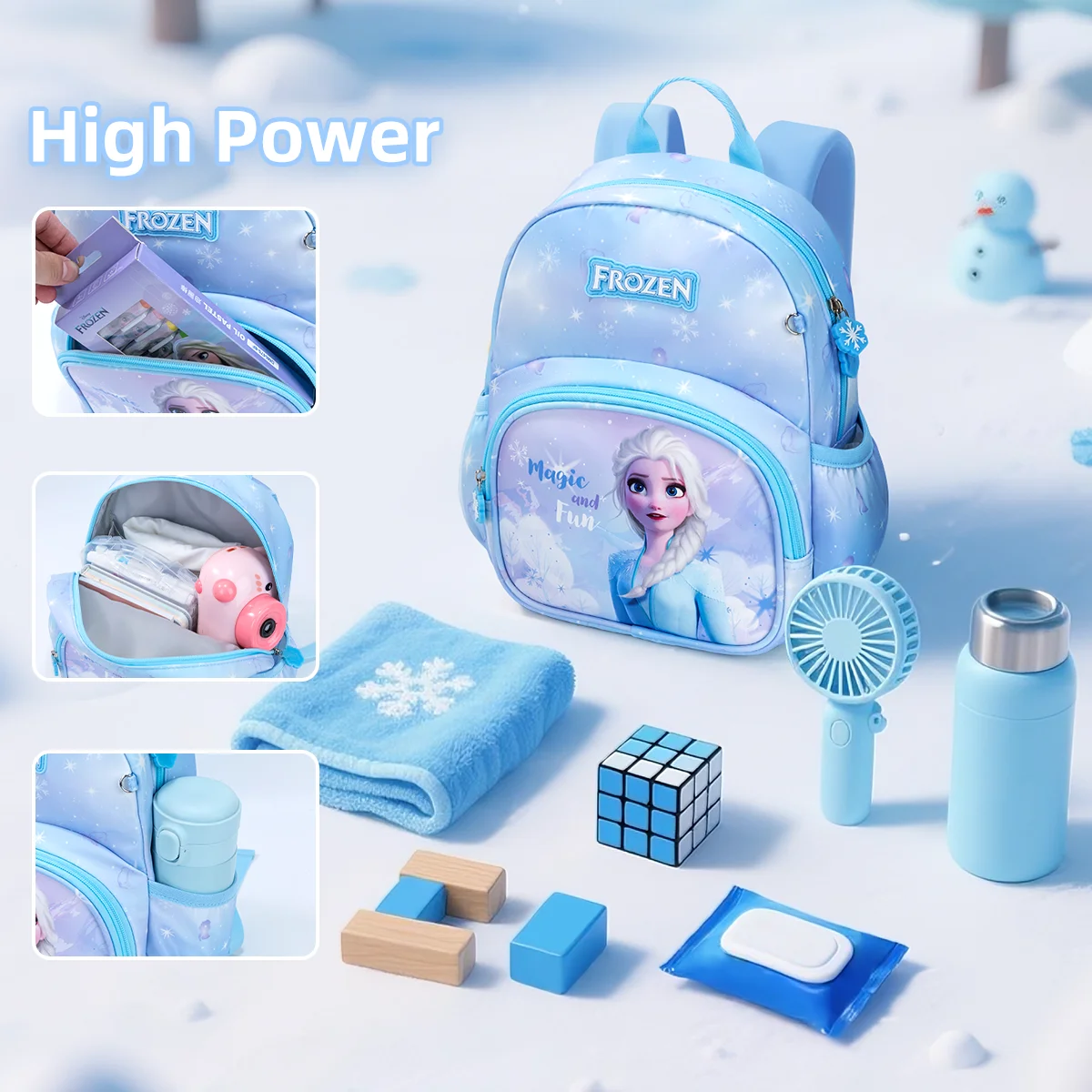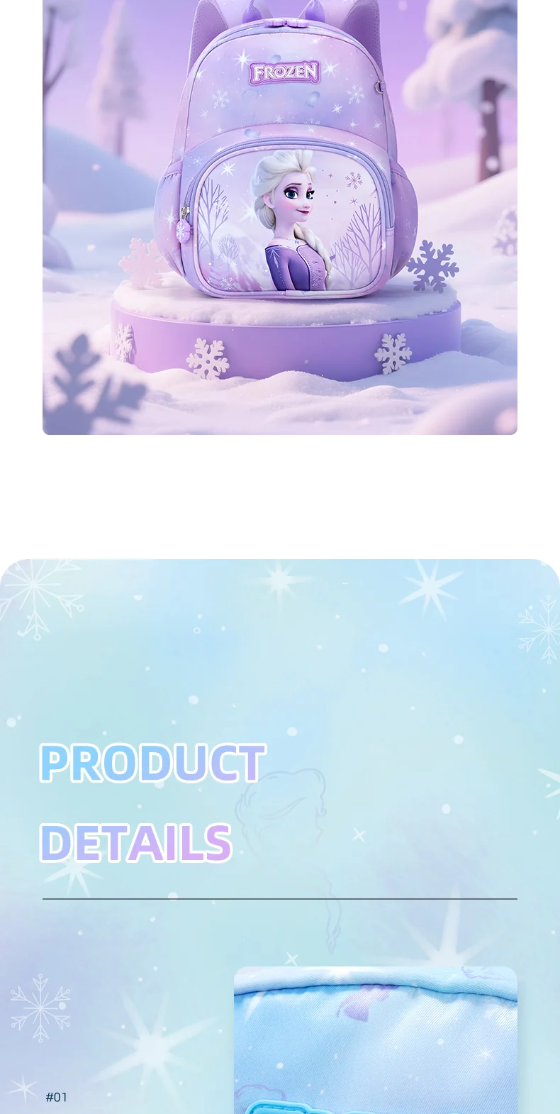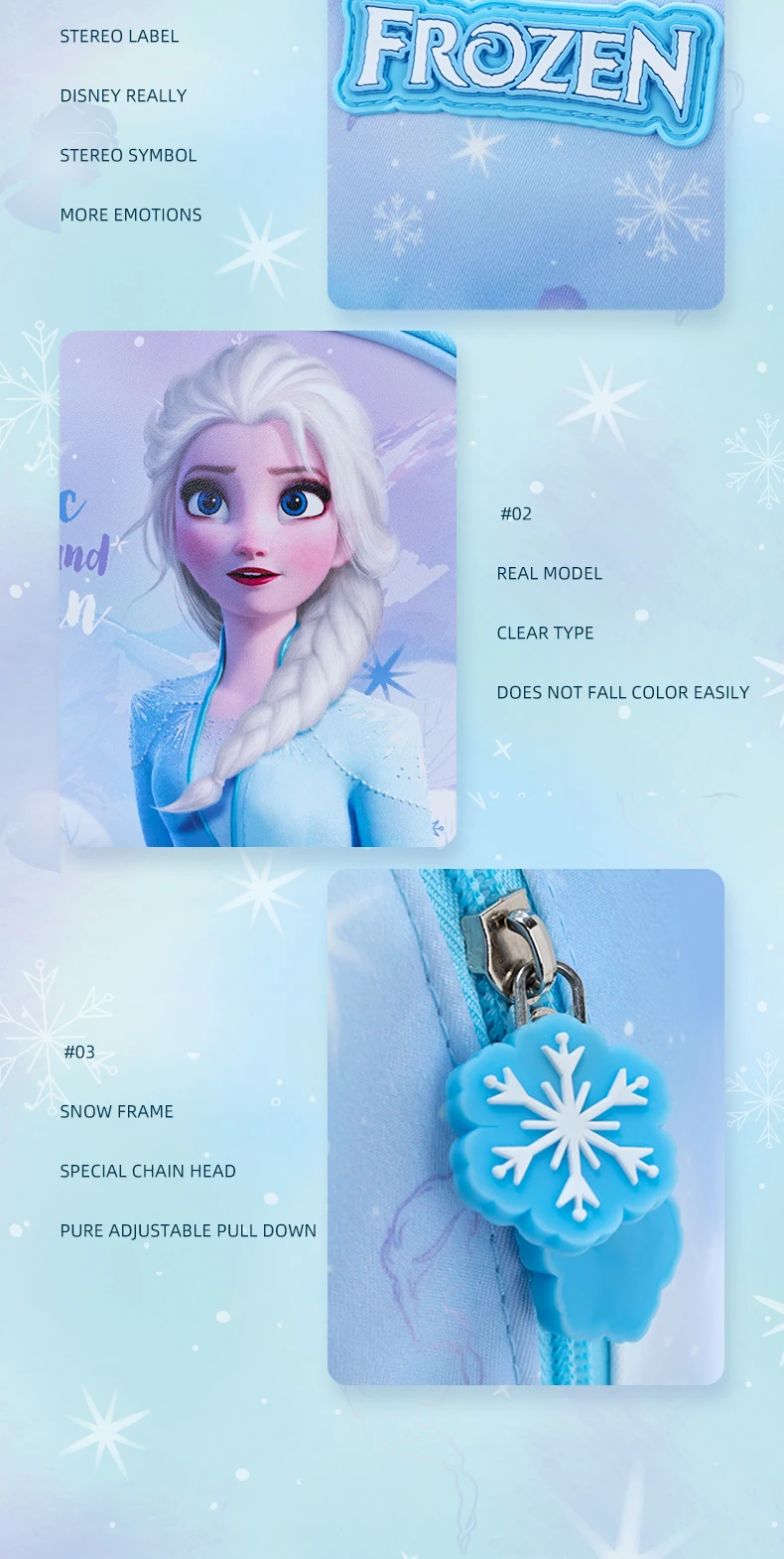 Magical Frozen Design: Vibrant Elsa prints + cute snowflake zipper charms, available in 2 dreamy colors (light blue/pastel purple) to match every little one’s style.