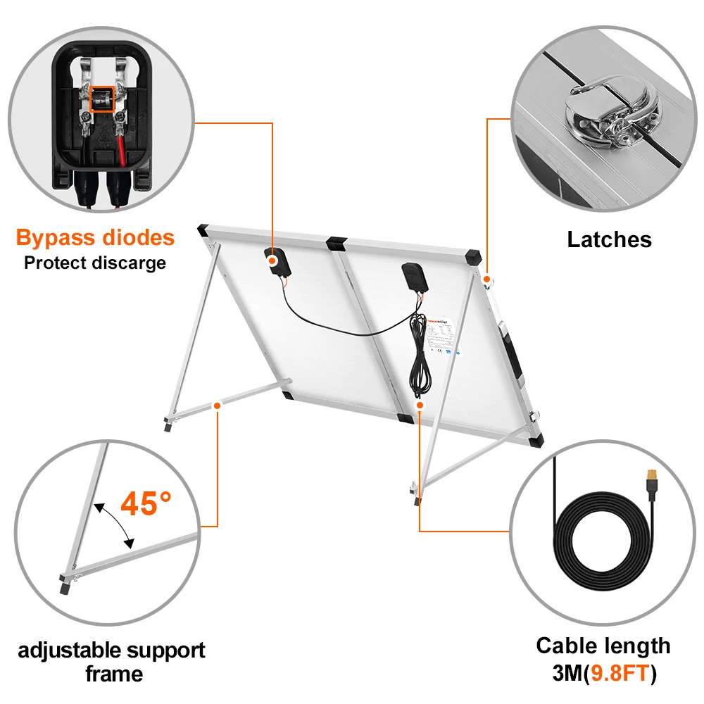 Due to product upgrades and production batch issues, the appearance and size of the product you receive may vary. The four corners of this solar panel are equipped with black corner guards to protect the solar panel. If the corner protector is damaged, you can contact us to replace the corner protector for free. But this does not affect the work of the solar panel. We do not accept compensation. Please understand that. Both 100W/150W and 200W solar panels come with a black DOKIO bag. For storing solar panels. Please avoid lifting heavy objects.