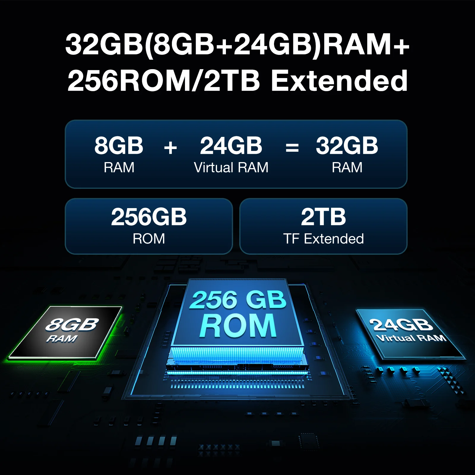 32GB RAM (8GB+Up to 24GB Extended RAM) / 256GB ROM |